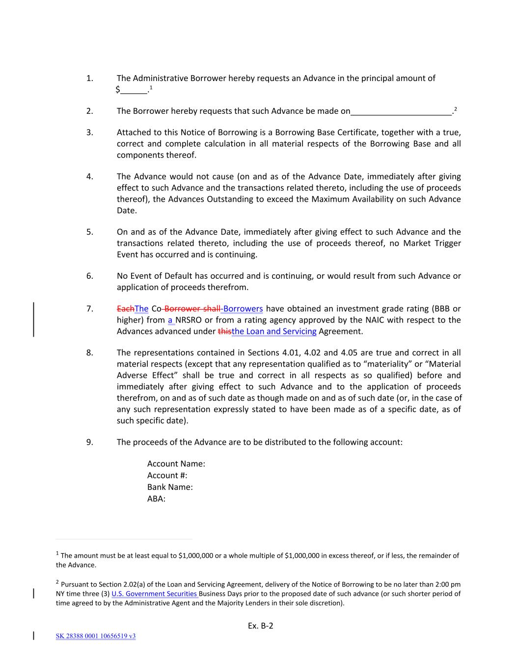 Ex. B‐2 SK 28388 0001 10656519 v3 2. The Borrower hereby requests that such Advance be made on                                   .2 3. Attached to this Notice of Borrowing is a Borrowing Base Certificate, together with a true, correct  and  complete  calculation  in  all material  respects  of  the Borrowing Base  and  all components thereof. 4. The Advance would not cause  (on and as of  the Advance Date,  immediately after giving effect to such Advance and the transactions related thereto, including the use of proceeds thereof), the Advances Outstanding to exceed the Maximum Availability on such Advance Date. 5. On and as of the Advance Date,  immediately after giving effect to such Advance and the transactions  related  thereto,  including  the  use  of  proceeds  thereof,  no Market  Trigger Event has occurred and is continuing. 6. No Event of Default has occurred and is continuing, or would result from such Advance or application of proceeds therefrom. 7. EachThe Co Borrower shall‐Borrowers have obtained an  investment grade rating  (BBB or higher) from a NRSRO or from a rating agency approved by the NAIC with respect to the Advances advanced under thisthe Loan and Servicing Agreement. 8. The representations contained  in Sections 4.01, 4.02 and 4.05 are  true and correct  in all material respects (except that any representation qualified as to “materiality” or “Material Adverse  Effect”  shall  be  true  and  correct  in  all  respects  as  so  qualified)  before  and immediately  after  giving  effect  to  such  Advance  and  to  the  application  of  proceeds therefrom, on and as of such date as though made on and as of such date (or, in the case of any  such  representation expressly  stated  to have been made as of a specific date, as of such specific date). 9. The proceeds of the Advance are to be distributed to the following account: Account Name: Account #: Bank Name: ABA: 1. The Administrative Borrower hereby requests an Advance in the principal amount of               $  .1 1 The amount must be at least equal to $1,000,000 or a whole multiple of $1,000,000 in excess thereof, or if less, the remainder of the Advance. 2 Pursuant to Section 2.02(a) of the Loan and Servicing Agreement, delivery of the Notice of Borrowing to be no later than 2:00 pm NY time three (3) U.S. Government Securities Business Days prior to the proposed date of such advance (or such shorter period of time agreed to by the Administrative Agent and the Majority Lenders in their sole discretion).