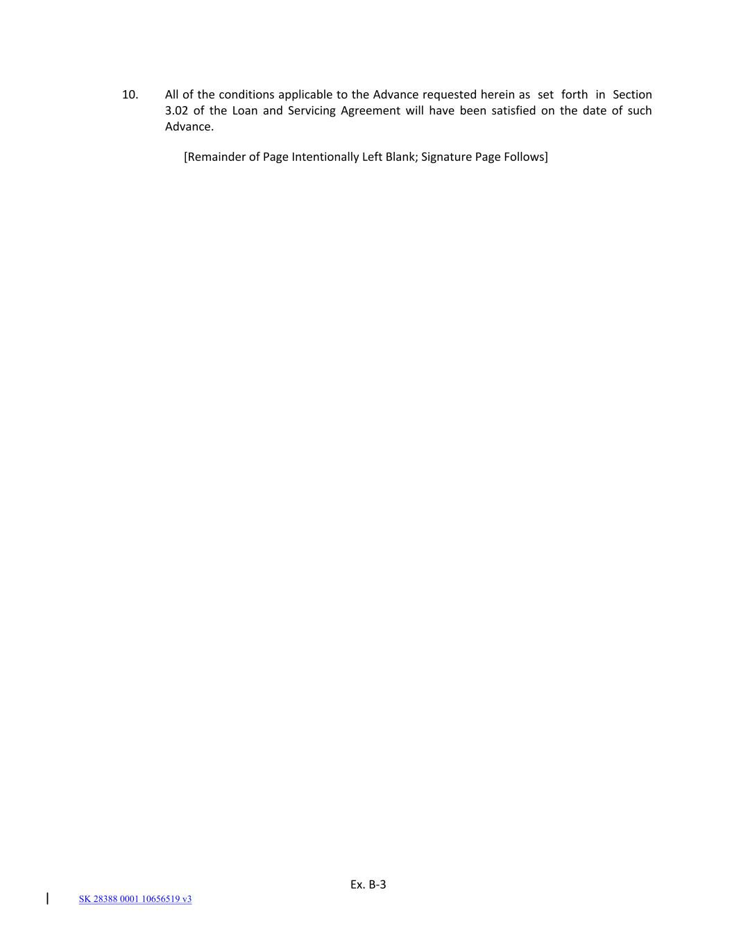 10. All of the conditions applicable to the Advance requested herein as  set  forth  in  Section 3.02 of  the  Loan  and  Servicing Agreement will have been  satisfied on  the date of  such Advance. [Remainder of Page Intentionally Left Blank; Signature Page Follows] Ex. B‐3 SK 28388 0001 10656519 v3