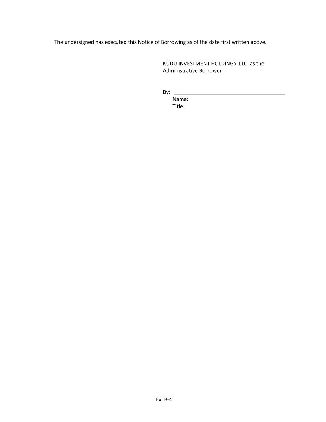 The undersigned has executed this Notice of Borrowing as of the date first written above. KUDU INVESTMENT HOLDINGS, LLC, as the Administrative Borrower By:     Name: Title: Ex. B‐4