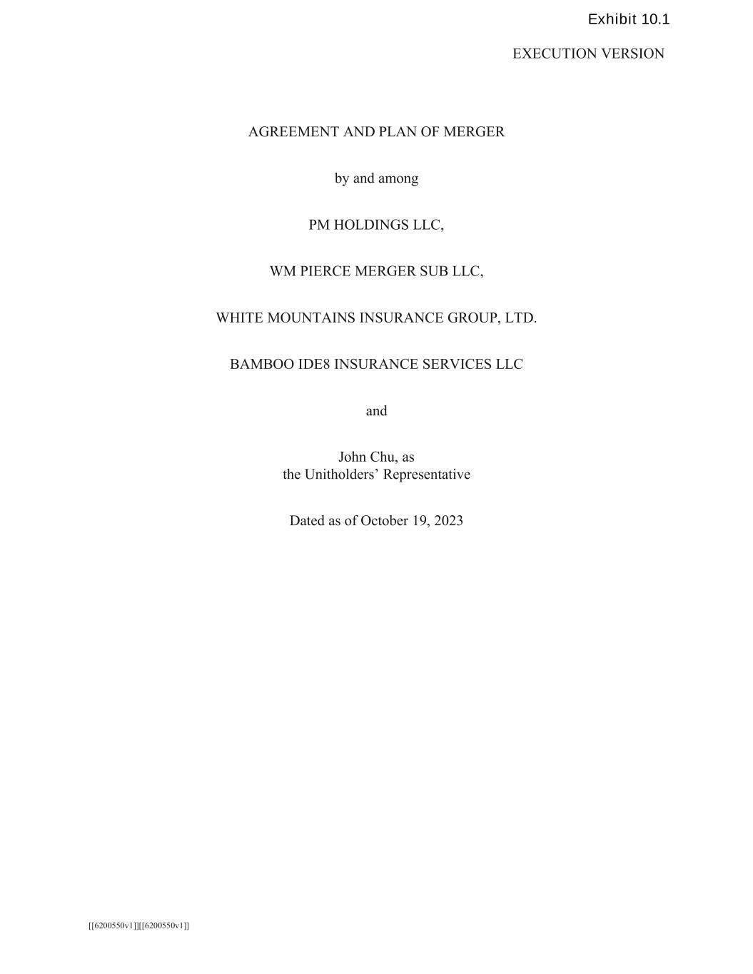 EXECUTION VERSION [[6200550v1]][[6200550v1]] AGREEMENT AND PLAN OF MERGER by and among PM HOLDINGS LLC, WM PIERCE MERGER SUB LLC, WHITE MOUNTAINS INSURANCE GROUP, LTD. BAMBOO IDE8 INSURANCE SERVICES LLC and John Chu, as the Unitholders’ Representative Dated as of October 19, 2023