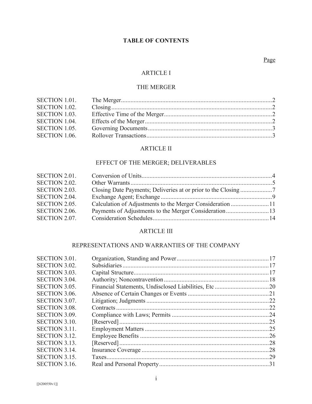i [[6200550v1]] TABLE OF CONTENTS Page ARTICLE I THE MERGER SECTION 1.01. The Merger ............................................................................................... 2 SECTION 1.02. Closing ..................................................................................................... 2 SECTION 1.03. Effective Time of the Merger.................................................................... 2 SECTION 1.04. Effects of the Merger ................................................................................ 2 SECTION 1.05. Governing Documents .............................................................................. 3 SECTION 1.06. Rollover Transactions ............................................................................... 3 ARTICLE II EFFECT OF THE MERGER; DELIVERABLES SECTION 2.01. Conversion of Units .................................................................................. 4 SECTION 2.02. Other Warrants ......................................................................................... 5 SECTION 2.03. Closing Date Payments; Deliveries at or prior to the Closing .................... 7 SECTION 2.04. Exchange Agent; Exchange ...................................................................... 9 SECTION 2.05. Calculation of Adjustments to the Merger Consideration ........................ 11 SECTION 2.06. Payments of Adjustments to the Merger Consideration ........................... 13 SECTION 2.07. Consideration Schedules ......................................................................... 14 ARTICLE III REPRESENTATIONS AND WARRANTIES OF THE COMPANY SECTION 3.01. Organization, Standing and Power .......................................................... 17 SECTION 3.02. Subsidiaries ............................................................................................ 17 SECTION 3.03. Capital Structure ..................................................................................... 17 SECTION 3.04. Authority; Noncontravention .................................................................. 18 SECTION 3.05. Financial Statements, Undisclosed Liabilities, Etc .................................. 20 SECTION 3.06. Absence of Certain Changes or Events ................................................... 21 SECTION 3.07. Litigation; Judgments ............................................................................. 22 SECTION 3.08. Contracts ................................................................................................ 22 SECTION 3.09. Compliance with Laws; Permits ............................................................. 24 SECTION 3.10. [Reserved] .............................................................................................. 25 SECTION 3.11. Employment Matters .............................................................................. 25 SECTION 3.12. Employee Benefits ................................................................................. 26 SECTION 3.13. [Reserved] .............................................................................................. 28 SECTION 3.14. Insurance Coverage ................................................................................ 28 SECTION 3.15. Taxes ...................................................................................................... 29 SECTION 3.16. Real and Personal Property ..................................................................... 31