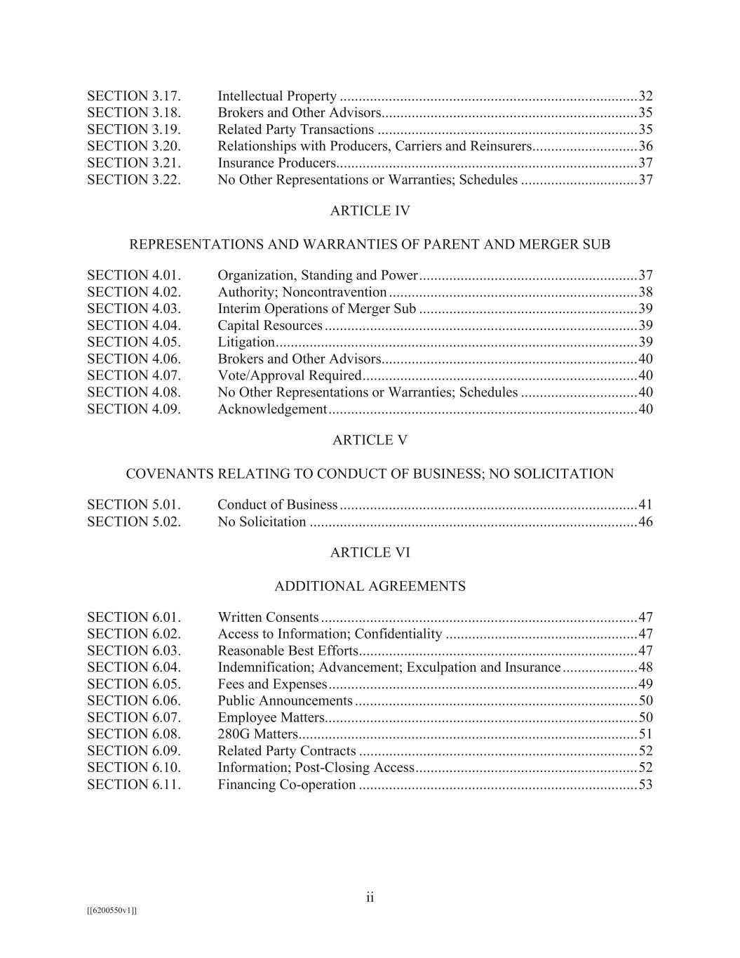 ii [[6200550v1]] SECTION 3.17. Intellectual Property ............................................................................... 32 SECTION 3.18. Brokers and Other Advisors .................................................................... 35 SECTION 3.19. Related Party Transactions ..................................................................... 35 SECTION 3.20. Relationships with Producers, Carriers and Reinsurers............................ 36 SECTION 3.21. Insurance Producers................................................................................ 37 SECTION 3.22. No Other Representations or Warranties; Schedules ............................... 37 ARTICLE IV REPRESENTATIONS AND WARRANTIES OF PARENT AND MERGER SUB SECTION 4.01. Organization, Standing and Power .......................................................... 37 SECTION 4.02. Authority; Noncontravention .................................................................. 38 SECTION 4.03. Interim Operations of Merger Sub .......................................................... 39 SECTION 4.04. Capital Resources ................................................................................... 39 SECTION 4.05. Litigation ................................................................................................ 39 SECTION 4.06. Brokers and Other Advisors .................................................................... 40 SECTION 4.07. Vote/Approval Required ......................................................................... 40 SECTION 4.08. No Other Representations or Warranties; Schedules ............................... 40 SECTION 4.09. Acknowledgement .................................................................................. 40 ARTICLE V COVENANTS RELATING TO CONDUCT OF BUSINESS; NO SOLICITATION SECTION 5.01. Conduct of Business ............................................................................... 41 SECTION 5.02. No Solicitation ....................................................................................... 46 ARTICLE VI ADDITIONAL AGREEMENTS SECTION 6.01. Written Consents .................................................................................... 47 SECTION 6.02. Access to Information; Confidentiality ................................................... 47 SECTION 6.03. Reasonable Best Efforts .......................................................................... 47 SECTION 6.04. Indemnification; Advancement; Exculpation and Insurance .................... 48 SECTION 6.05. Fees and Expenses .................................................................................. 49 SECTION 6.06. Public Announcements ........................................................................... 50 SECTION 6.07. Employee Matters................................................................................... 50 SECTION 6.08. 280G Matters .......................................................................................... 51 SECTION 6.09. Related Party Contracts .......................................................................... 52 SECTION 6.10. Information; Post-Closing Access ........................................................... 52 SECTION 6.11. Financing Co-operation .......................................................................... 53