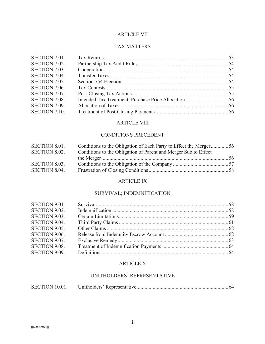 iii [[6200550v1]] ARTICLE VII TAX MATTERS SECTION 7.01. Tax Returns ............................................................................................ 53 SECTION 7.02. Partnership Tax Audit Rules ................................................................... 54 SECTION 7.03. Cooperation ............................................................................................ 54 SECTION 7.04. Transfer Taxes ........................................................................................ 54 SECTION 7.05. Section 754 Election ............................................................................... 54 SECTION 7.06. Tax Contests ........................................................................................... 55 SECTION 7.07. Post-Closing Tax Actions ....................................................................... 55 SECTION 7.08. Intended Tax Treatment; Purchase Price Allocation ................................ 56 SECTION 7.09. Allocation of Taxes ................................................................................ 56 SECTION 7.10. Treatment of Post-Closing Payments ...................................................... 56 ARTICLE VIII CONDITIONS PRECEDENT SECTION 8.01. Conditions to the Obligation of Each Party to Effect the Merger ............. 56 SECTION 8.02. Conditions to the Obligation of Parent and Merger Sub to Effect the Merger .............................................................................................. 56 SECTION 8.03. Conditions to the Obligation of the Company ......................................... 57 SECTION 8.04. Frustration of Closing Conditions ........................................................... 58 ARTICLE IX SURVIVAL; INDEMNIFICATION SECTION 9.01. Survival .................................................................................................. 58 SECTION 9.02. Indemnification ...................................................................................... 58 SECTION 9.03. Certain Limitations ................................................................................. 59 SECTION 9.04. Third Party Claims ................................................................................. 61 SECTION 9.05. Other Claims .......................................................................................... 62 SECTION 9.06. Release from Indemnity Escrow Account ............................................... 62 SECTION 9.07. Exclusive Remedy .................................................................................. 63 SECTION 9.08. Treatment of Indemnification Payments ................................................. 64 SECTION 9.09. Definitions.............................................................................................. 64 ARTICLE X UNITHOLDERS’ REPRESENTATIVE SECTION 10.01. Unitholders’ Representative .................................................................... 64