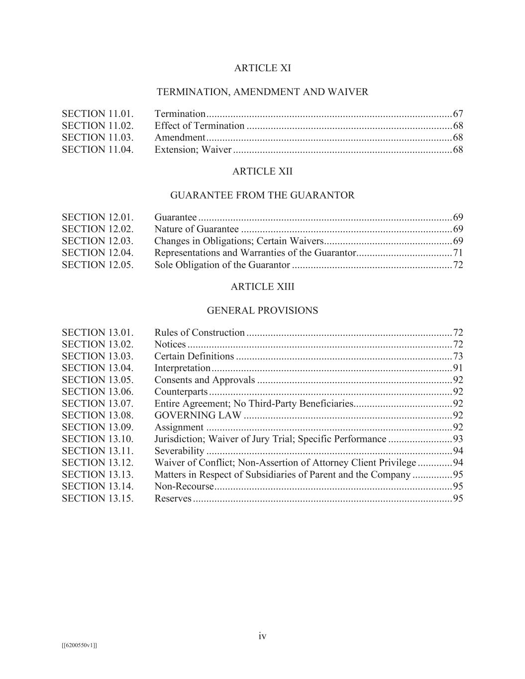 iv [[6200550v1]] ARTICLE XI TERMINATION, AMENDMENT AND WAIVER SECTION 11.01. Termination ............................................................................................ 67 SECTION 11.02. Effect of Termination ............................................................................. 68 SECTION 11.03. Amendment ............................................................................................ 68 SECTION 11.04. Extension; Waiver .................................................................................. 68 ARTICLE XII GUARANTEE FROM THE GUARANTOR SECTION 12.01. Guarantee ............................................................................................... 69 SECTION 12.02. Nature of Guarantee ............................................................................... 69 SECTION 12.03. Changes in Obligations; Certain Waivers ................................................ 69 SECTION 12.04. Representations and Warranties of the Guarantor.................................... 71 SECTION 12.05. Sole Obligation of the Guarantor ............................................................ 72 ARTICLE XIII GENERAL PROVISIONS SECTION 13.01. Rules of Construction ............................................................................. 72 SECTION 13.02. Notices ................................................................................................... 72 SECTION 13.03. Certain Definitions ................................................................................. 73 SECTION 13.04. Interpretation .......................................................................................... 91 SECTION 13.05. Consents and Approvals ......................................................................... 92 SECTION 13.06. Counterparts ........................................................................................... 92 SECTION 13.07. Entire Agreement; No Third-Party Beneficiaries..................................... 92 SECTION 13.08. GOVERNING LAW .............................................................................. 92 SECTION 13.09. Assignment ............................................................................................ 92 SECTION 13.10. Jurisdiction; Waiver of Jury Trial; Specific Performance ........................ 93 SECTION 13.11. Severability ............................................................................................ 94 SECTION 13.12. Waiver of Conflict; Non-Assertion of Attorney Client Privilege ............. 94 SECTION 13.13. Matters in Respect of Subsidiaries of Parent and the Company ............... 95 SECTION 13.14. Non-Recourse ......................................................................................... 95 SECTION 13.15. Reserves ................................................................................................. 95
