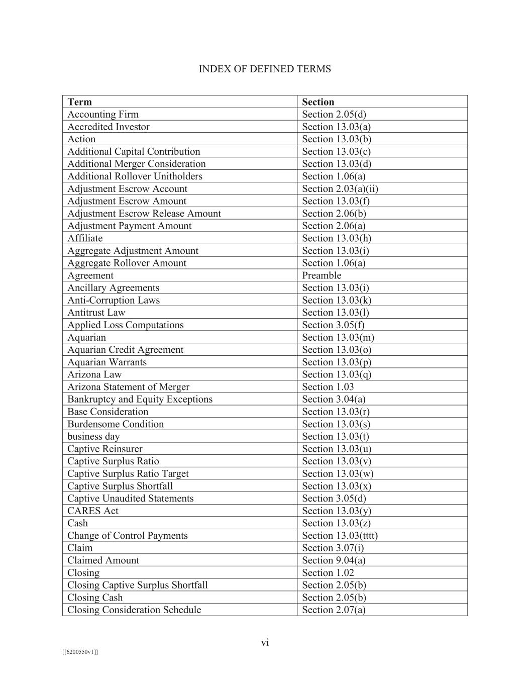 vi [[6200550v1]] INDEX OF DEFINED TERMS Term Section Accounting Firm Section 2.05(d) Accredited Investor Section 13.03(a) Action Section 13.03(b) Additional Capital Contribution Section 13.03(c) Additional Merger Consideration Section 13.03(d) Additional Rollover Unitholders Section 1.06(a) Adjustment Escrow Account Section 2.03(a)(ii) Adjustment Escrow Amount Section 13.03(f) Adjustment Escrow Release Amount Section 2.06(b) Adjustment Payment Amount Section 2.06(a) Affiliate Section 13.03(h) Aggregate Adjustment Amount Section 13.03(i) Aggregate Rollover Amount Section 1.06(a) Agreement Preamble Ancillary Agreements Section 13.03(i) Anti-Corruption Laws Section 13.03(k) Antitrust Law Section 13.03(l) Applied Loss Computations Section 3.05(f) Aquarian Section 13.03(m) Aquarian Credit Agreement Section 13.03(o) Aquarian Warrants Section 13.03(p) Arizona Law Section 13.03(q) Arizona Statement of Merger Section 1.03 Bankruptcy and Equity Exceptions Section 3.04(a) Base Consideration Section 13.03(r) Burdensome Condition Section 13.03(s) business day Section 13.03(t) Captive Reinsurer Section 13.03(u) Captive Surplus Ratio Section 13.03(v) Captive Surplus Ratio Target Section 13.03(w) Captive Surplus Shortfall Section 13.03(x) Captive Unaudited Statements Section 3.05(d) CARES Act Section 13.03(y) Cash Section 13.03(z) Change of Control Payments Section 13.03(tttt) Claim Section 3.07(i) Claimed Amount Section 9.04(a) Closing Section 1.02 Closing Captive Surplus Shortfall Section 2.05(b) Closing Cash Section 2.05(b) Closing Consideration Schedule Section 2.07(a)