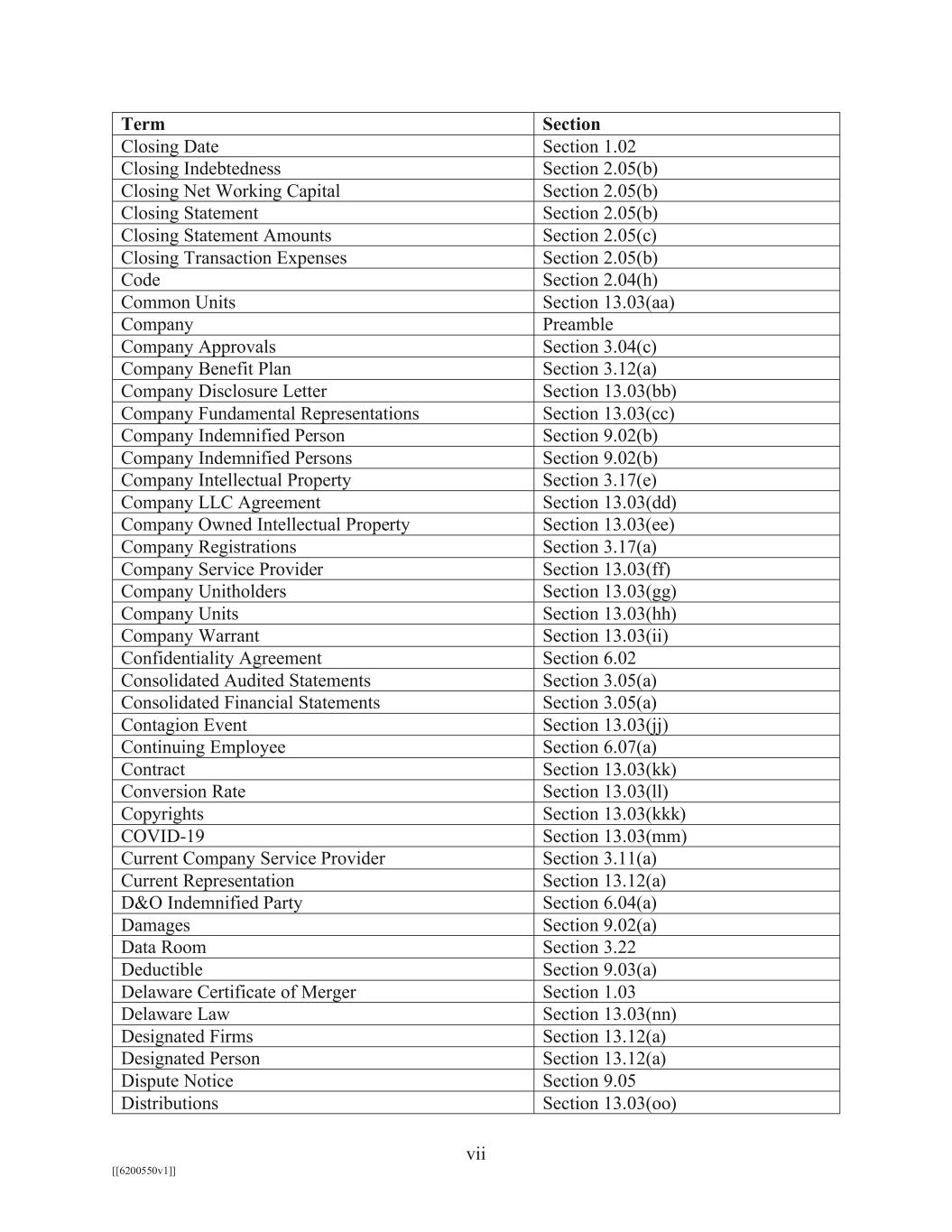 vii [[6200550v1]] Term Section Closing Date Section 1.02 Closing Indebtedness Section 2.05(b) Closing Net Working Capital Section 2.05(b) Closing Statement Section 2.05(b) Closing Statement Amounts Section 2.05(c) Closing Transaction Expenses Section 2.05(b) Code Section 2.04(h) Common Units Section 13.03(aa) Company Preamble Company Approvals Section 3.04(c) Company Benefit Plan Section 3.12(a) Company Disclosure Letter Section 13.03(bb) Company Fundamental Representations Section 13.03(cc) Company Indemnified Person Section 9.02(b) Company Indemnified Persons Section 9.02(b) Company Intellectual Property Section 3.17(e) Company LLC Agreement Section 13.03(dd) Company Owned Intellectual Property Section 13.03(ee) Company Registrations Section 3.17(a) Company Service Provider Section 13.03(ff) Company Unitholders Section 13.03(gg) Company Units Section 13.03(hh) Company Warrant Section 13.03(ii) Confidentiality Agreement Section 6.02 Consolidated Audited Statements Section 3.05(a) Consolidated Financial Statements Section 3.05(a) Contagion Event Section 13.03(jj) Continuing Employee Section 6.07(a) Contract Section 13.03(kk) Conversion Rate Section 13.03(ll) Copyrights Section 13.03(kkk) COVID-19 Section 13.03(mm) Current Company Service Provider Section 3.11(a) Current Representation Section 13.12(a) D&O Indemnified Party Section 6.04(a) Damages Section 9.02(a) Data Room Section 3.22 Deductible Section 9.03(a) Delaware Certificate of Merger Section 1.03 Delaware Law Section 13.03(nn) Designated Firms Section 13.12(a) Designated Person Section 13.12(a) Dispute Notice Section 9.05 Distributions Section 13.03(oo)