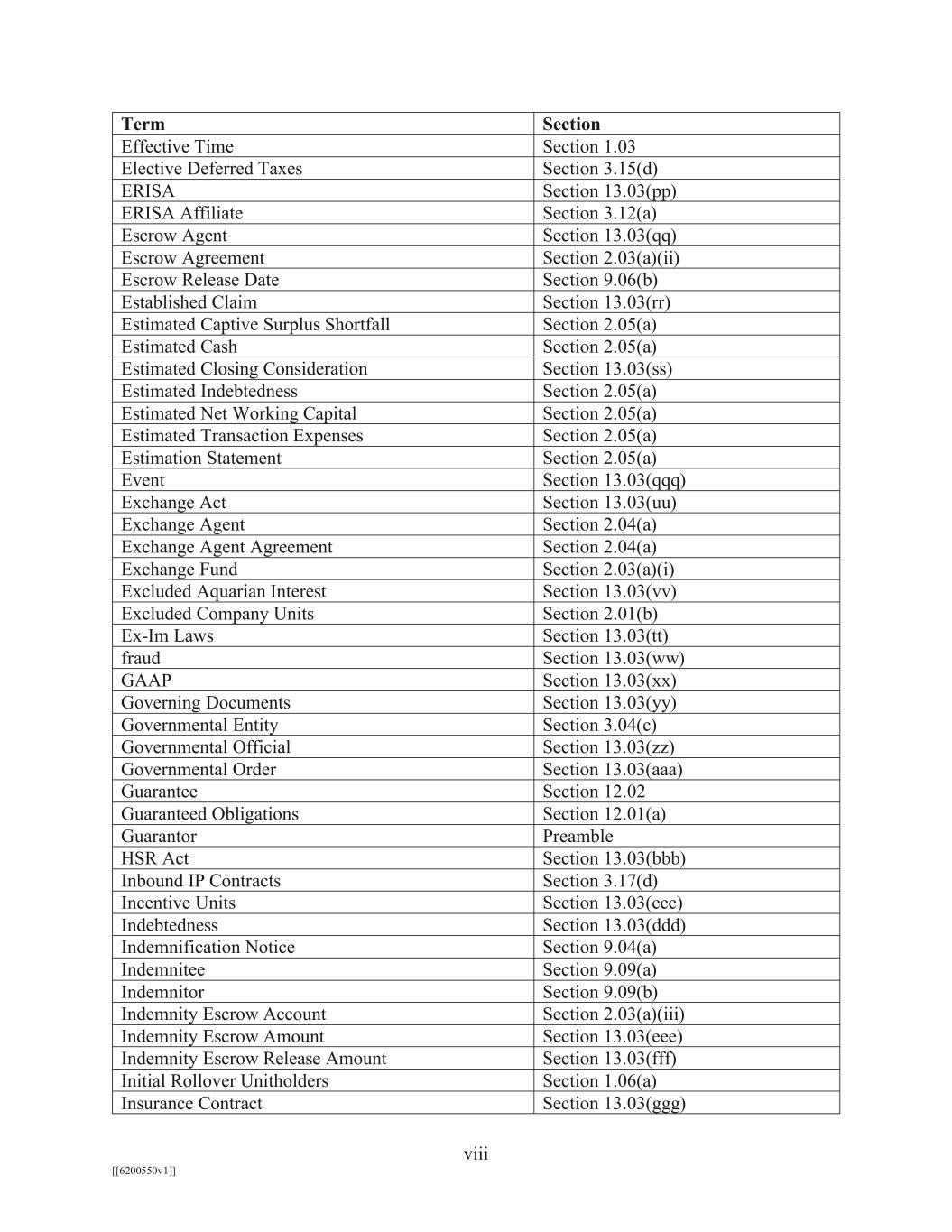 viii [[6200550v1]] Term Section Effective Time Section 1.03 Elective Deferred Taxes Section 3.15(d) ERISA Section 13.03(pp) ERISA Affiliate Section 3.12(a) Escrow Agent Section 13.03(qq) Escrow Agreement Section 2.03(a)(ii) Escrow Release Date Section 9.06(b) Established Claim Section 13.03(rr) Estimated Captive Surplus Shortfall Section 2.05(a) Estimated Cash Section 2.05(a) Estimated Closing Consideration Section 13.03(ss) Estimated Indebtedness Section 2.05(a) Estimated Net Working Capital Section 2.05(a) Estimated Transaction Expenses Section 2.05(a) Estimation Statement Section 2.05(a) Event Section 13.03(qqq) Exchange Act Section 13.03(uu) Exchange Agent Section 2.04(a) Exchange Agent Agreement Section 2.04(a) Exchange Fund Section 2.03(a)(i) Excluded Aquarian Interest Section 13.03(vv) Excluded Company Units Section 2.01(b) Ex-Im Laws Section 13.03(tt) fraud Section 13.03(ww) GAAP Section 13.03(xx) Governing Documents Section 13.03(yy) Governmental Entity Section 3.04(c) Governmental Official Section 13.03(zz) Governmental Order Section 13.03(aaa) Guarantee Section 12.02 Guaranteed Obligations Section 12.01(a) Guarantor Preamble HSR Act Section 13.03(bbb) Inbound IP Contracts Section 3.17(d) Incentive Units Section 13.03(ccc) Indebtedness Section 13.03(ddd) Indemnification Notice Section 9.04(a) Indemnitee Section 9.09(a) Indemnitor Section 9.09(b) Indemnity Escrow Account Section 2.03(a)(iii) Indemnity Escrow Amount Section 13.03(eee) Indemnity Escrow Release Amount Section 13.03(fff) Initial Rollover Unitholders Section 1.06(a) Insurance Contract Section 13.03(ggg)
