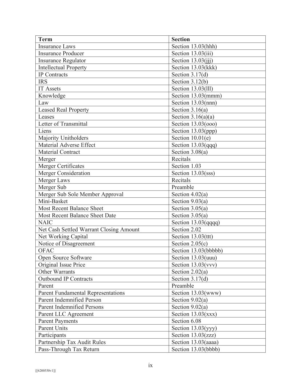 ix [[6200550v1]] Term Section Insurance Laws Section 13.03(hhh) Insurance Producer Section 13.03(iii) Insurance Regulator Section 13.03(jjj) Intellectual Property Section 13.03(kkk) IP Contracts Section 3.17(d) IRS Section 3.12(b) IT Assets Section 13.03(lll) Knowledge Section 13.03(mmm) Law Section 13.03(nnn) Leased Real Property Section 3.16(a) Leases Section 3.16(a)(a) Letter of Transmittal Section 13.03(ooo) Liens Section 13.03(ppp) Majority Unitholders Section 10.01(e) Material Adverse Effect Section 13.03(qqq) Material Contract Section 3.08(a) Merger Recitals Merger Certificates Section 1.03 Merger Consideration Section 13.03(sss) Merger Laws Recitals Merger Sub Preamble Merger Sub Sole Member Approval Section 4.02(a) Mini-Basket Section 9.03(a) Most Recent Balance Sheet Section 3.05(a) Most Recent Balance Sheet Date Section 3.05(a) NAIC Section 13.03(qqqq) Net Cash Settled Warrant Closing Amount Section 2.02 Net Working Capital Section 13.03(ttt) Notice of Disagreement Section 2.05(c) OFAC Section 13.03(bbbbb) Open Source Software Section 13.03(uuu) Original Issue Price Section 13.03(vvv) Other Warrants Section 2.02(a) Outbound IP Contracts Section 3.17(d) Parent Preamble Parent Fundamental Representations Section 13.03(www) Parent Indemnified Person Section 9.02(a) Parent Indemnified Persons Section 9.02(a) Parent LLC Agreement Section 13.03(xxx) Parent Payments Section 6.08 Parent Units Section 13.03(yyy) Participants Section 13.03(zzz) Partnership Tax Audit Rules Section 13.03(aaaa) Pass-Through Tax Return Section 13.03(bbbb)