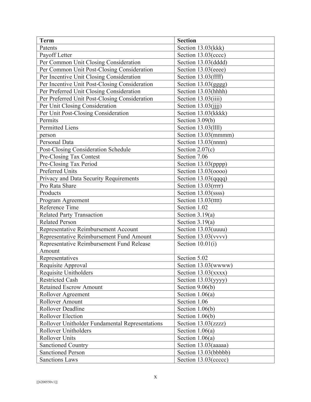 x [[6200550v1]] Term Section Patents Section 13.03(kkk) Payoff Letter Section 13.03(cccc) Per Common Unit Closing Consideration Section 13.03(dddd) Per Common Unit Post-Closing Consideration Section 13.03(eeee) Per Incentive Unit Closing Consideration Section 13.03(ffff) Per Incentive Unit Post-Closing Consideration Section 13.03(gggg) Per Preferred Unit Closing Consideration Section 13.03(hhhh) Per Preferred Unit Post-Closing Consideration Section 13.03(iiii) Per Unit Closing Consideration Section 13.03(jjjj) Per Unit Post-Closing Consideration Section 13.03(kkkk) Permits Section 3.09(b) Permitted Liens Section 13.03(llll) person Section 13.03(mmmm) Personal Data Section 13.03(nnnn) Post-Closing Consideration Schedule Section 2.07(c) Pre-Closing Tax Contest Section 7.06 Pre-Closing Tax Period Section 13.03(pppp) Preferred Units Section 13.03(oooo) Privacy and Data Security Requirements Section 13.03(qqqq) Pro Rata Share Section 13.03(rrrr) Products Section 13.03(ssss) Program Agreement Section 13.03(tttt) Reference Time Section 1.02 Related Party Transaction Section 3.19(a) Related Person Section 3.19(a) Representative Reimbursement Account Section 13.03(uuuu) Representative Reimbursement Fund Amount Section 13.03(vvvv) Representative Reimbursement Fund Release Amount Section 10.01(i) Representatives Section 5.02 Requisite Approval Section 13.03(wwww) Requisite Unitholders Section 13.03(xxxx) Restricted Cash Section 13.03(yyyy) Retained Escrow Amount Section 9.06(b) Rollover Agreement Section 1.06(a) Rollover Amount Section 1.06 Rollover Deadline Section 1.06(b) Rollover Election Section 1.06(b) Rollover Unitholder Fundamental Representations Section 13.03(zzzz) Rollover Unitholders Section 1.06(a) Rollover Units Section 1.06(a) Sanctioned Country Section 13.03(aaaaa) Sanctioned Person Section 13.03(bbbbb) Sanctions Laws Section 13.03(ccccc)