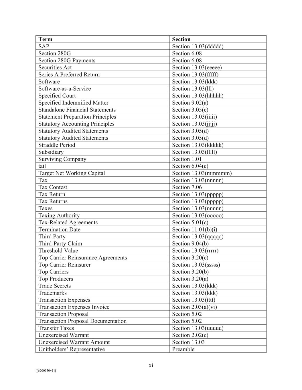 xi [[6200550v1]] Term Section SAP Section 13.03(ddddd) Section 280G Section 6.08 Section 280G Payments Section 6.08 Securities Act Section 13.03(eeeee) Series A Preferred Return Section 13.03(fffff) Software Section 13.03(kkk) Software-as-a-Service Section 13.03(lll) Specified Court Section 13.03(hhhhh) Specified Indemnified Matter Section 9.02(a) Standalone Financial Statements Section 3.05(c) Statement Preparation Principles Section 13.03(iiiii) Statutory Accounting Principles Section 13.03(jjjjj) Statutory Audited Statements Section 3.05(d) Statutory Audited Statements Section 3.05(d) Straddle Period Section 13.03(kkkkk) Subsidiary Section 13.03(lllll) Surviving Company Section 1.01 tail Section 6.04(c) Target Net Working Capital Section 13.03(mmmmm) Tax Section 13.03(nnnnn) Tax Contest Section 7.06 Tax Return Section 13.03(ppppp) Tax Returns Section 13.03(ppppp) Taxes Section 13.03(nnnnn) Taxing Authority Section 13.03(ooooo) Tax-Related Agreements Section 5.01(c) Termination Date Section 11.01(b)(i) Third Party Section 13.03(qqqqq) Third-Party Claim Section 9.04(b) Threshold Value Section 13.03(rrrrr) Top Carrier Reinsurance Agreements Section 3.20(c) Top Carrier Reinsurer Section 13.03(sssss) Top Carriers Section 3.20(b) Top Producers Section 3.20(a) Trade Secrets Section 13.03(kkk) Trademarks Section 13.03(kkk) Transaction Expenses Section 13.03(tttt) Transaction Expenses Invoice Section 2.03(a)(vi) Transaction Proposal Section 5.02 Transaction Proposal Documentation Section 5.02 Transfer Taxes Section 13.03(uuuuu) Unexercised Warrant Section 2.02(c) Unexercised Warrant Amount Section 13.03 Unitholders’ Representative Preamble