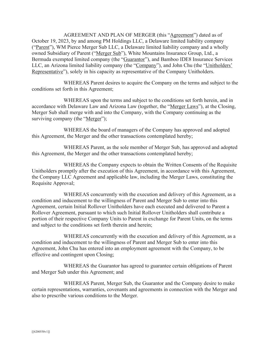 [[6200550v1]] AGREEMENT AND PLAN OF MERGER (this “Agreement”) dated as of October 19, 2023, by and among PM Holdings LLC, a Delaware limited liability company (“Parent”), WM Pierce Merger Sub LLC, a Delaware limited liability company and a wholly owned Subsidiary of Parent (“Merger Sub”), White Mountains Insurance Group, Ltd., a Bermuda exempted limited company (the “Guarantor”), and Bamboo IDE8 Insurance Services LLC, an Arizona limited liability company (the “Company”), and John Chu (the “Unitholders’ Representative”), solely in his capacity as representative of the Company Unitholders. WHEREAS Parent desires to acquire the Company on the terms and subject to the conditions set forth in this Agreement; WHEREAS upon the terms and subject to the conditions set forth herein, and in accordance with Delaware Law and Arizona Law (together, the “Merger Laws”), at the Closing, Merger Sub shall merge with and into the Company, with the Company continuing as the surviving company (the “Merger”); WHEREAS the board of managers of the Company has approved and adopted this Agreement, the Merger and the other transactions contemplated hereby; WHEREAS Parent, as the sole member of Merger Sub, has approved and adopted this Agreement, the Merger and the other transactions contemplated hereby; WHEREAS the Company expects to obtain the Written Consents of the Requisite Unitholders promptly after the execution of this Agreement, in accordance with this Agreement, the Company LLC Agreement and applicable law, including the Merger Laws, constituting the Requisite Approval; WHEREAS concurrently with the execution and delivery of this Agreement, as a condition and inducement to the willingness of Parent and Merger Sub to enter into this Agreement, certain Initial Rollover Unitholders have each executed and delivered to Parent a Rollover Agreement, pursuant to which such Initial Rollover Unitholders shall contribute a portion of their respective Company Units to Parent in exchange for Parent Units, on the terms and subject to the conditions set forth therein and herein; WHEREAS concurrently with the execution and delivery of this Agreement, as a condition and inducement to the willingness of Parent and Merger Sub to enter into this Agreement, John Chu has entered into an employment agreement with the Company, to be effective and contingent upon Closing; WHEREAS the Guarantor has agreed to guarantee certain obligations of Parent and Merger Sub under this Agreement; and WHEREAS Parent, Merger Sub, the Guarantor and the Company desire to make certain representations, warranties, covenants and agreements in connection with the Merger and also to prescribe various conditions to the Merger.