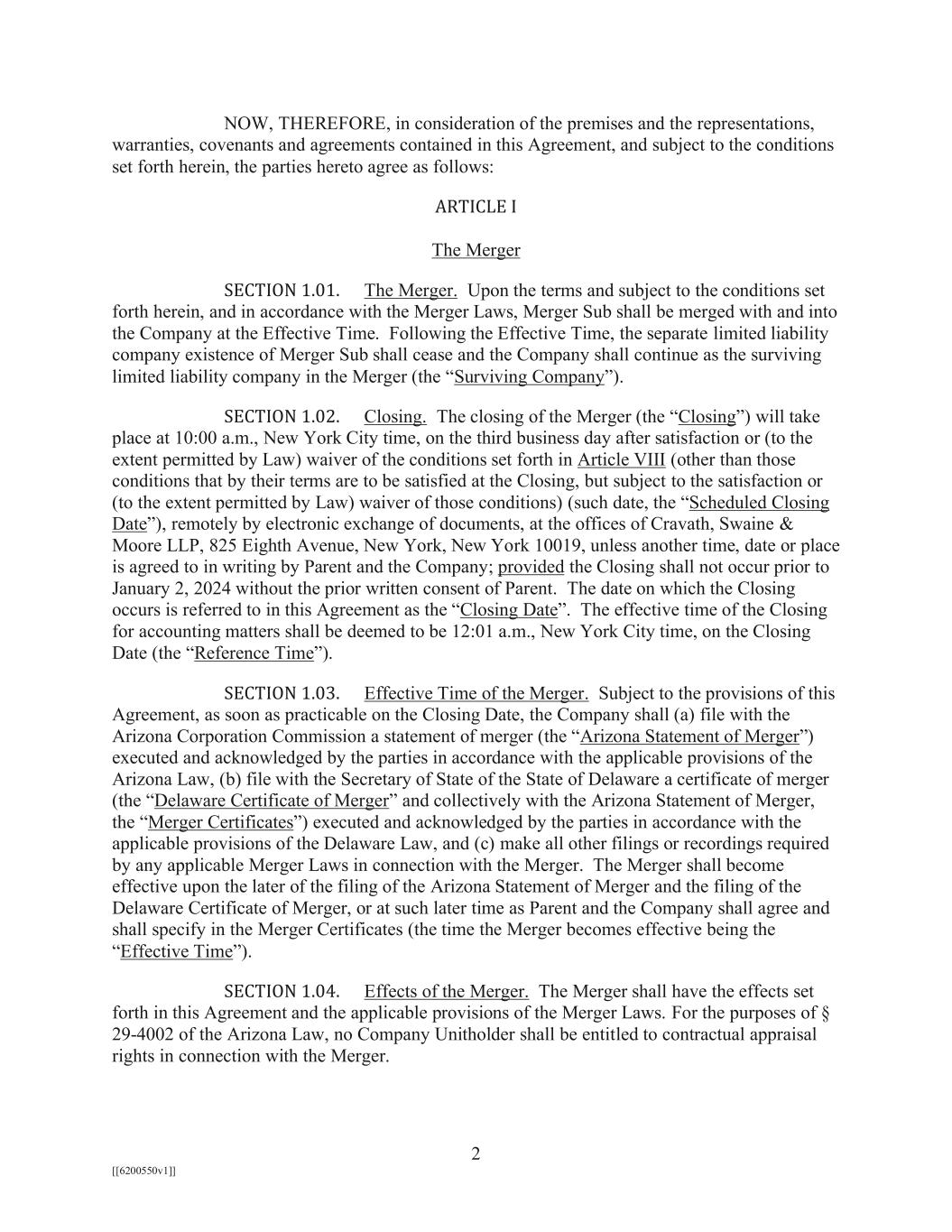 2 [[6200550v1]] NOW, THEREFORE, in consideration of the premises and the representations, warranties, covenants and agreements contained in this Agreement, and subject to the conditions set forth herein, the parties hereto agree as follows: The Merger The Merger. Upon the terms and subject to the conditions set forth herein, and in accordance with the Merger Laws, Merger Sub shall be merged with and into the Company at the Effective Time. Following the Effective Time, the separate limited liability company existence of Merger Sub shall cease and the Company shall continue as the surviving limited liability company in the Merger (the “Surviving Company”). Closing. The closing of the Merger (the “Closing”) will take place at 10:00 a.m., New York City time, on the third business day after satisfaction or (to the extent permitted by Law) waiver of the conditions set forth in Article VIII (other than those conditions that by their terms are to be satisfied at the Closing, but subject to the satisfaction or (to the extent permitted by Law) waiver of those conditions) (such date, the “Scheduled Closing Date”), remotely by electronic exchange of documents, at the offices of Cravath, Swaine & Moore LLP, 825 Eighth Avenue, New York, New York 10019, unless another time, date or place is agreed to in writing by Parent and the Company; provided the Closing shall not occur prior to January 2, 2024 without the prior written consent of Parent. The date on which the Closing occurs is referred to in this Agreement as the “Closing Date”. The effective time of the Closing for accounting matters shall be deemed to be 12:01 a.m., New York City time, on the Closing Date (the “Reference Time”). Effective Time of the Merger. Subject to the provisions of this Agreement, as soon as practicable on the Closing Date, the Company shall (a) file with the Arizona Corporation Commission a statement of merger (the “Arizona Statement of Merger”) executed and acknowledged by the parties in accordance with the applicable provisions of the Arizona Law, (b) file with the Secretary of State of the State of Delaware a certificate of merger (the “Delaware Certificate of Merger” and collectively with the Arizona Statement of Merger, the “Merger Certificates”) executed and acknowledged by the parties in accordance with the applicable provisions of the Delaware Law, and (c) make all other filings or recordings required by any applicable Merger Laws in connection with the Merger. The Merger shall become effective upon the later of the filing of the Arizona Statement of Merger and the filing of the Delaware Certificate of Merger, or at such later time as Parent and the Company shall agree and shall specify in the Merger Certificates (the time the Merger becomes effective being the “Effective Time”). Effects of the Merger. The Merger shall have the effects set forth in this Agreement and the applicable provisions of the Merger Laws. For the purposes of § 29-4002 of the Arizona Law, no Company Unitholder shall be entitled to contractual appraisal rights in connection with the Merger.