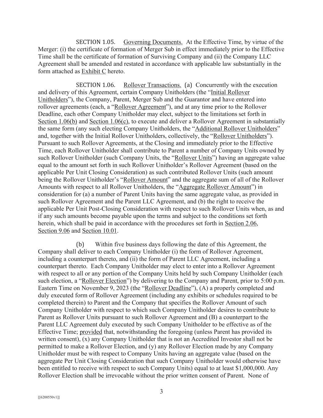 3 [[6200550v1]] Governing Documents. At the Effective Time, by virtue of the Merger: (i) the certificate of formation of Merger Sub in effect immediately prior to the Effective Time shall be the certificate of formation of Surviving Company and (ii) the Company LLC Agreement shall be amended and restated in accordance with applicable law substantially in the form attached as Exhibit C hereto. Rollover Transactions. Concurrently with the execution and delivery of this Agreement, certain Company Unitholders (the “Initial Rollover Unitholders”), the Company, Parent, Merger Sub and the Guarantor and have entered into rollover agreements (each, a “Rollover Agreement”), and at any time prior to the Rollover Deadline, each other Company Unitholder may elect, subject to the limitations set forth in Section 1.06(b) and Section 1.06(c), to execute and deliver a Rollover Agreement in substantially the same form (any such electing Company Unitholders, the “Additional Rollover Unitholders” and, together with the Initial Rollover Unitholders, collectively, the “Rollover Unitholders”). Pursuant to such Rollover Agreements, at the Closing and immediately prior to the Effective Time, each Rollover Unitholder shall contribute to Parent a number of Company Units owned by such Rollover Unitholder (such Company Units, the “Rollover Units”) having an aggregate value equal to the amount set forth in such Rollover Unitholder’s Rollover Agreement (based on the applicable Per Unit Closing Consideration) as such contributed Rollover Units (such amount being the Rollover Unitholder’s “Rollover Amount” and the aggregate sum of all of the Rollover Amounts with respect to all Rollover Unitholders, the “Aggregate Rollover Amount”) in consideration for (a) a number of Parent Units having the same aggregate value, as provided in such Rollover Agreement and the Parent LLC Agreement, and (b) the right to receive the applicable Per Unit Post-Closing Consideration with respect to such Rollover Units when, as and if any such amounts become payable upon the terms and subject to the conditions set forth herein, which shall be paid in accordance with the procedures set forth in Section 2.06, Section 9.06 and Section 10.01. Within five business days following the date of this Agreement, the Company shall deliver to each Company Unitholder (i) the form of Rollover Agreement, including a counterpart thereto, and (ii) the form of Parent LLC Agreement, including a counterpart thereto. Each Company Unitholder may elect to enter into a Rollover Agreement with respect to all or any portion of the Company Units held by such Company Unitholder (each such election, a “Rollover Election”) by delivering to the Company and Parent, prior to 5:00 p.m. Eastern Time on November 9, 2023 (the “Rollover Deadline”), (A) a properly completed and duly executed form of Rollover Agreement (including any exhibits or schedules required to be completed therein) to Parent and the Company that specifies the Rollover Amount of such Company Unitholder with respect to which such Company Unitholder desires to contribute to Parent as Rollover Units pursuant to such Rollover Agreement and (B) a counterpart to the Parent LLC Agreement duly executed by such Company Unitholder to be effective as of the Effective Time; provided that, notwithstanding the foregoing (unless Parent has provided its written consent), (x) any Company Unitholder that is not an Accredited Investor shall not be permitted to make a Rollover Election, and (y) any Rollover Election made by any Company Unitholder must be with respect to Company Units having an aggregate value (based on the aggregate Per Unit Closing Consideration that such Company Unitholder would otherwise have been entitled to receive with respect to such Company Units) equal to at least $1,000,000. Any Rollover Election shall be irrevocable without the prior written consent of Parent. None of