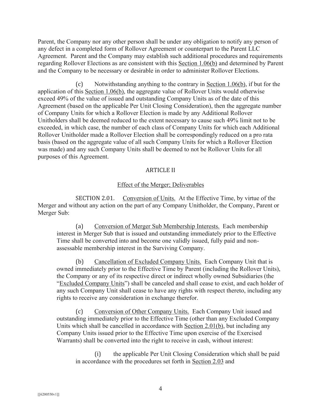 4 [[6200550v1]] Parent, the Company nor any other person shall be under any obligation to notify any person of any defect in a completed form of Rollover Agreement or counterpart to the Parent LLC Agreement. Parent and the Company may establish such additional procedures and requirements regarding Rollover Elections as are consistent with this Section 1.06(b) and determined by Parent and the Company to be necessary or desirable in order to administer Rollover Elections. Notwithstanding anything to the contrary in Section 1.06(b), if but for the application of this Section 1.06(b), the aggregate value of Rollover Units would otherwise exceed 49% of the value of issued and outstanding Company Units as of the date of this Agreement (based on the applicable Per Unit Closing Consideration), then the aggregate number of Company Units for which a Rollover Election is made by any Additional Rollover Unitholders shall be deemed reduced to the extent necessary to cause such 49% limit not to be exceeded, in which case, the number of each class of Company Units for which each Additional Rollover Unitholder made a Rollover Election shall be correspondingly reduced on a pro rata basis (based on the aggregate value of all such Company Units for which a Rollover Election was made) and any such Company Units shall be deemed to not be Rollover Units for all purposes of this Agreement. Effect of the Merger; Deliverables Conversion of Units. At the Effective Time, by virtue of the Merger and without any action on the part of any Company Unitholder, the Company, Parent or Merger Sub: Conversion of Merger Sub Membership Interests. Each membership interest in Merger Sub that is issued and outstanding immediately prior to the Effective Time shall be converted into and become one validly issued, fully paid and non- assessable membership interest in the Surviving Company. Cancellation of Excluded Company Units. Each Company Unit that is owned immediately prior to the Effective Time by Parent (including the Rollover Units), the Company or any of its respective direct or indirect wholly owned Subsidiaries (the “Excluded Company Units”) shall be canceled and shall cease to exist, and each holder of any such Company Unit shall cease to have any rights with respect thereto, including any rights to receive any consideration in exchange therefor. Conversion of Other Company Units. Each Company Unit issued and outstanding immediately prior to the Effective Time (other than any Excluded Company Units which shall be cancelled in accordance with Section 2.01(b), but including any Company Units issued prior to the Effective Time upon exercise of the Exercised Warrants) shall be converted into the right to receive in cash, without interest: the applicable Per Unit Closing Consideration which shall be paid in accordance with the procedures set forth in Section 2.03 and