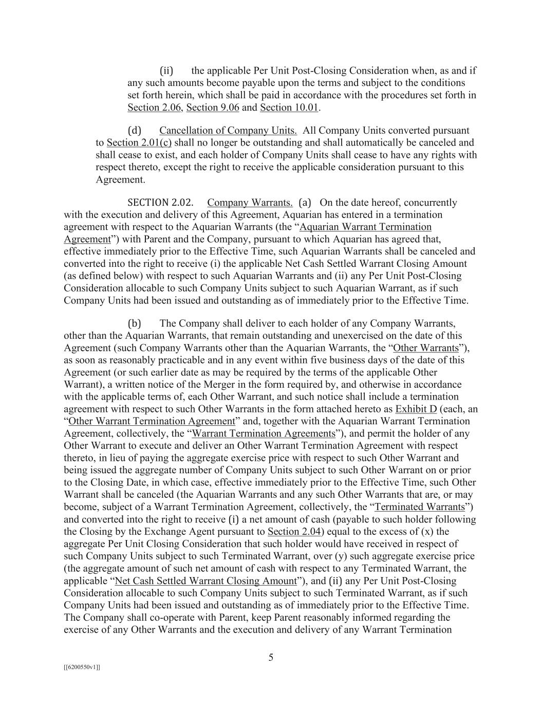 5 [[6200550v1]] the applicable Per Unit Post-Closing Consideration when, as and if any such amounts become payable upon the terms and subject to the conditions set forth herein, which shall be paid in accordance with the procedures set forth in Section 2.06, Section 9.06 and Section 10.01. Cancellation of Company Units. All Company Units converted pursuant to Section 2.01(c) shall no longer be outstanding and shall automatically be canceled and shall cease to exist, and each holder of Company Units shall cease to have any rights with respect thereto, except the right to receive the applicable consideration pursuant to this Agreement. Company Warrants. On the date hereof, concurrently with the execution and delivery of this Agreement, Aquarian has entered in a termination agreement with respect to the Aquarian Warrants (the “Aquarian Warrant Termination Agreement”) with Parent and the Company, pursuant to which Aquarian has agreed that, effective immediately prior to the Effective Time, such Aquarian Warrants shall be canceled and converted into the right to receive (i) the applicable Net Cash Settled Warrant Closing Amount (as defined below) with respect to such Aquarian Warrants and (ii) any Per Unit Post-Closing Consideration allocable to such Company Units subject to such Aquarian Warrant, as if such Company Units had been issued and outstanding as of immediately prior to the Effective Time. The Company shall deliver to each holder of any Company Warrants, other than the Aquarian Warrants, that remain outstanding and unexercised on the date of this Agreement (such Company Warrants other than the Aquarian Warrants, the “Other Warrants”), as soon as reasonably practicable and in any event within five business days of the date of this Agreement (or such earlier date as may be required by the terms of the applicable Other Warrant), a written notice of the Merger in the form required by, and otherwise in accordance with the applicable terms of, each Other Warrant, and such notice shall include a termination agreement with respect to such Other Warrants in the form attached hereto as Exhibit D (each, an “Other Warrant Termination Agreement” and, together with the Aquarian Warrant Termination Agreement, collectively, the “Warrant Termination Agreements”), and permit the holder of any Other Warrant to execute and deliver an Other Warrant Termination Agreement with respect thereto, in lieu of paying the aggregate exercise price with respect to such Other Warrant and being issued the aggregate number of Company Units subject to such Other Warrant on or prior to the Closing Date, in which case, effective immediately prior to the Effective Time, such Other Warrant shall be canceled (the Aquarian Warrants and any such Other Warrants that are, or may become, subject of a Warrant Termination Agreement, collectively, the “Terminated Warrants”) and converted into the right to receive a net amount of cash (payable to such holder following the Closing by the Exchange Agent pursuant to Section 2.04) equal to the excess of (x) the aggregate Per Unit Closing Consideration that such holder would have received in respect of such Company Units subject to such Terminated Warrant, over (y) such aggregate exercise price (the aggregate amount of such net amount of cash with respect to any Terminated Warrant, the applicable “Net Cash Settled Warrant Closing Amount”), and any Per Unit Post-Closing Consideration allocable to such Company Units subject to such Terminated Warrant, as if such Company Units had been issued and outstanding as of immediately prior to the Effective Time. The Company shall co-operate with Parent, keep Parent reasonably informed regarding the exercise of any Other Warrants and the execution and delivery of any Warrant Termination