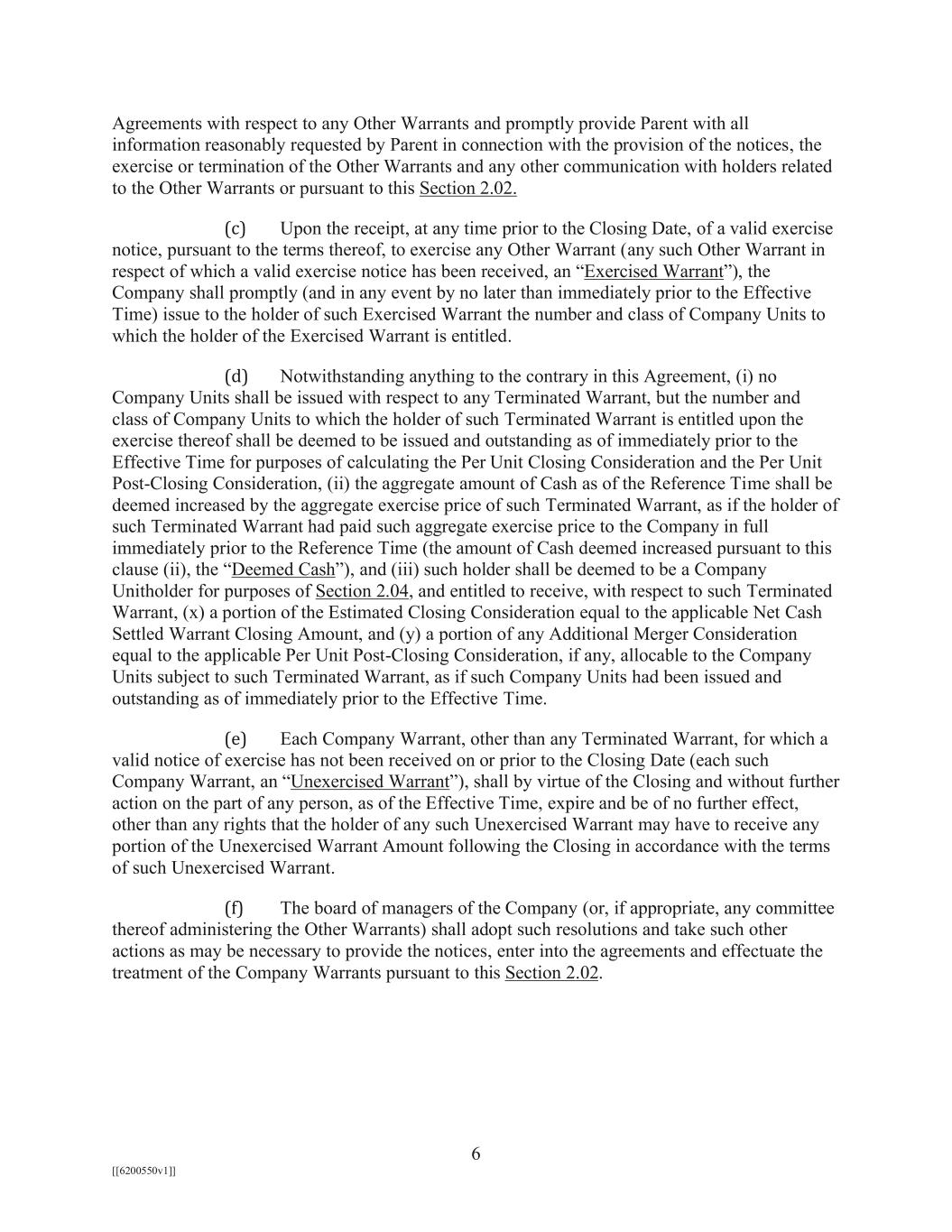 6 [[6200550v1]] Agreements with respect to any Other Warrants and promptly provide Parent with all information reasonably requested by Parent in connection with the provision of the notices, the exercise or termination of the Other Warrants and any other communication with holders related to the Other Warrants or pursuant to this Section 2.02. Upon the receipt, at any time prior to the Closing Date, of a valid exercise notice, pursuant to the terms thereof, to exercise any Other Warrant (any such Other Warrant in respect of which a valid exercise notice has been received, an “Exercised Warrant”), the Company shall promptly (and in any event by no later than immediately prior to the Effective Time) issue to the holder of such Exercised Warrant the number and class of Company Units to which the holder of the Exercised Warrant is entitled. Notwithstanding anything to the contrary in this Agreement, (i) no Company Units shall be issued with respect to any Terminated Warrant, but the number and class of Company Units to which the holder of such Terminated Warrant is entitled upon the exercise thereof shall be deemed to be issued and outstanding as of immediately prior to the Effective Time for purposes of calculating the Per Unit Closing Consideration and the Per Unit Post-Closing Consideration, (ii) the aggregate amount of Cash as of the Reference Time shall be deemed increased by the aggregate exercise price of such Terminated Warrant, as if the holder of such Terminated Warrant had paid such aggregate exercise price to the Company in full immediately prior to the Reference Time (the amount of Cash deemed increased pursuant to this clause (ii), the “Deemed Cash”), and (iii) such holder shall be deemed to be a Company Unitholder for purposes of Section 2.04, and entitled to receive, with respect to such Terminated Warrant, (x) a portion of the Estimated Closing Consideration equal to the applicable Net Cash Settled Warrant Closing Amount, and (y) a portion of any Additional Merger Consideration equal to the applicable Per Unit Post-Closing Consideration, if any, allocable to the Company Units subject to such Terminated Warrant, as if such Company Units had been issued and outstanding as of immediately prior to the Effective Time. Each Company Warrant, other than any Terminated Warrant, for which a valid notice of exercise has not been received on or prior to the Closing Date (each such Company Warrant, an “Unexercised Warrant”), shall by virtue of the Closing and without further action on the part of any person, as of the Effective Time, expire and be of no further effect, other than any rights that the holder of any such Unexercised Warrant may have to receive any portion of the Unexercised Warrant Amount following the Closing in accordance with the terms of such Unexercised Warrant. The board of managers of the Company (or, if appropriate, any committee thereof administering the Other Warrants) shall adopt such resolutions and take such other actions as may be necessary to provide the notices, enter into the agreements and effectuate the treatment of the Company Warrants pursuant to this Section 2.02.