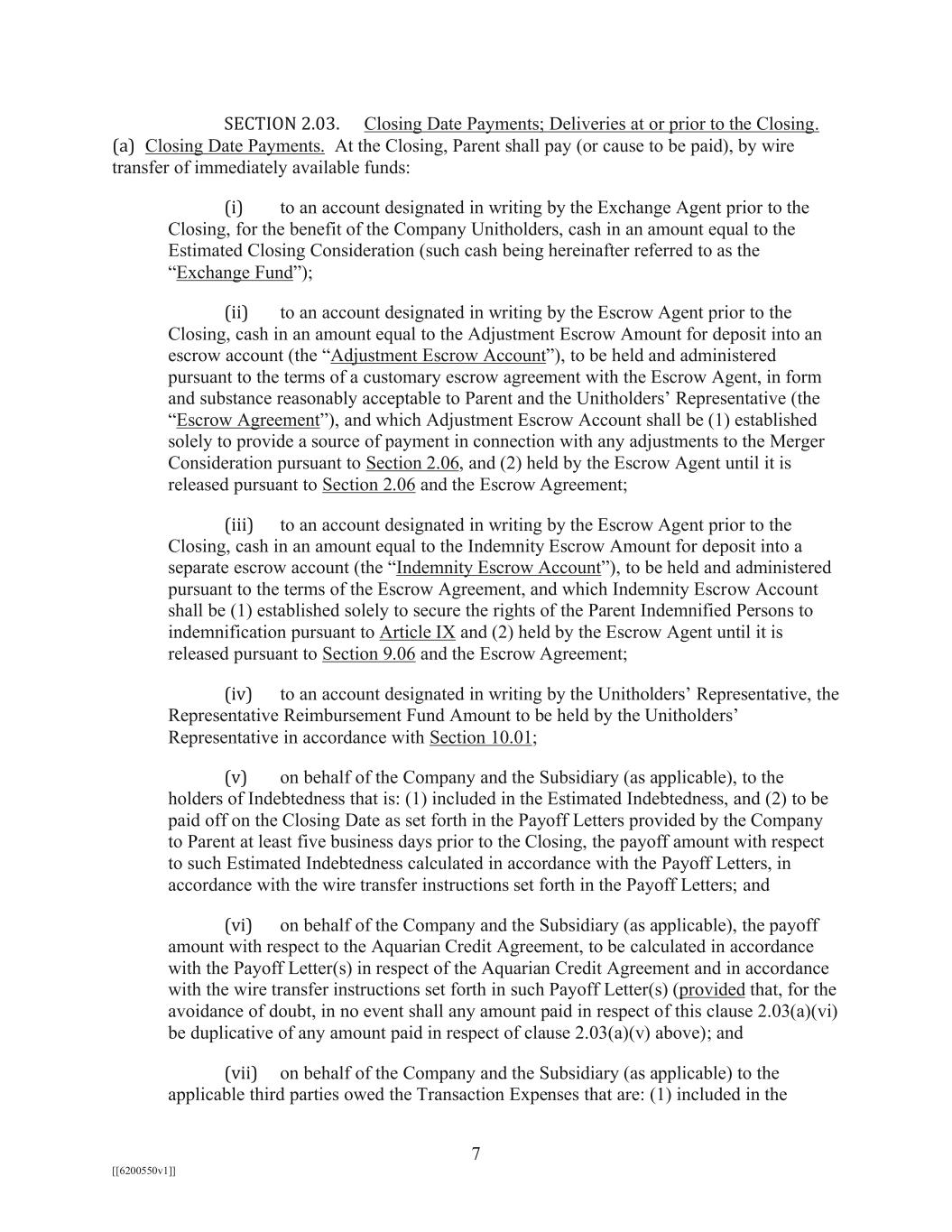 7 [[6200550v1]] Closing Date Payments; Deliveries at or prior to the Closing. Closing Date Payments. At the Closing, Parent shall pay (or cause to be paid), by wire transfer of immediately available funds: to an account designated in writing by the Exchange Agent prior to the Closing, for the benefit of the Company Unitholders, cash in an amount equal to the Estimated Closing Consideration (such cash being hereinafter referred to as the “Exchange Fund”); to an account designated in writing by the Escrow Agent prior to the Closing, cash in an amount equal to the Adjustment Escrow Amount for deposit into an escrow account (the “Adjustment Escrow Account”), to be held and administered pursuant to the terms of a customary escrow agreement with the Escrow Agent, in form and substance reasonably acceptable to Parent and the Unitholders’ Representative (the “Escrow Agreement”), and which Adjustment Escrow Account shall be (1) established solely to provide a source of payment in connection with any adjustments to the Merger Consideration pursuant to Section 2.06, and (2) held by the Escrow Agent until it is released pursuant to Section 2.06 and the Escrow Agreement; to an account designated in writing by the Escrow Agent prior to the Closing, cash in an amount equal to the Indemnity Escrow Amount for deposit into a separate escrow account (the “Indemnity Escrow Account”), to be held and administered pursuant to the terms of the Escrow Agreement, and which Indemnity Escrow Account shall be (1) established solely to secure the rights of the Parent Indemnified Persons to indemnification pursuant to Article IX and (2) held by the Escrow Agent until it is released pursuant to Section 9.06 and the Escrow Agreement; to an account designated in writing by the Unitholders’ Representative, the Representative Reimbursement Fund Amount to be held by the Unitholders’ Representative in accordance with Section 10.01; on behalf of the Company and the Subsidiary (as applicable), to the holders of Indebtedness that is: (1) included in the Estimated Indebtedness, and (2) to be paid off on the Closing Date as set forth in the Payoff Letters provided by the Company to Parent at least five business days prior to the Closing, the payoff amount with respect to such Estimated Indebtedness calculated in accordance with the Payoff Letters, in accordance with the wire transfer instructions set forth in the Payoff Letters; and on behalf of the Company and the Subsidiary (as applicable), the payoff amount with respect to the Aquarian Credit Agreement, to be calculated in accordance with the Payoff Letter(s) in respect of the Aquarian Credit Agreement and in accordance with the wire transfer instructions set forth in such Payoff Letter(s) (provided that, for the avoidance of doubt, in no event shall any amount paid in respect of this clause 2.03(a)(vi) be duplicative of any amount paid in respect of clause 2.03(a)(v) above); and on behalf of the Company and the Subsidiary (as applicable) to the applicable third parties owed the Transaction Expenses that are: (1) included in the