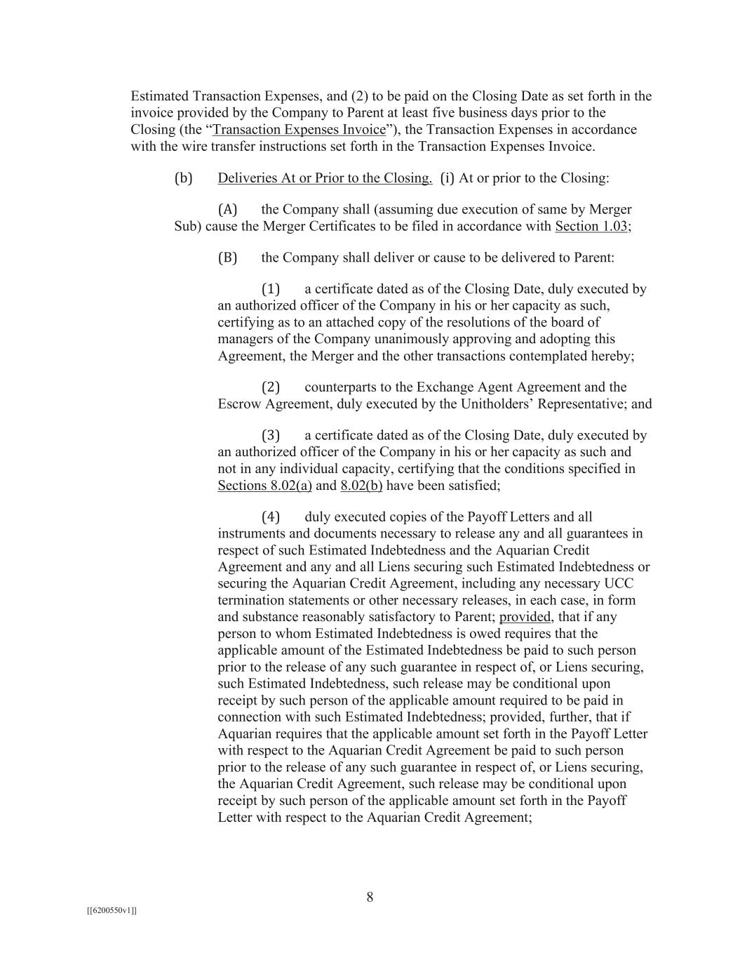 8 [[6200550v1]] Estimated Transaction Expenses, and (2) to be paid on the Closing Date as set forth in the invoice provided by the Company to Parent at least five business days prior to the Closing (the “Transaction Expenses Invoice”), the Transaction Expenses in accordance with the wire transfer instructions set forth in the Transaction Expenses Invoice. Deliveries At or Prior to the Closing. At or prior to the Closing: the Company shall (assuming due execution of same by Merger Sub) cause the Merger Certificates to be filed in accordance with Section 1.03; the Company shall deliver or cause to be delivered to Parent: a certificate dated as of the Closing Date, duly executed by an authorized officer of the Company in his or her capacity as such, certifying as to an attached copy of the resolutions of the board of managers of the Company unanimously approving and adopting this Agreement, the Merger and the other transactions contemplated hereby; counterparts to the Exchange Agent Agreement and the Escrow Agreement, duly executed by the Unitholders’ Representative; and a certificate dated as of the Closing Date, duly executed by an authorized officer of the Company in his or her capacity as such and not in any individual capacity, certifying that the conditions specified in Sections 8.02(a) and 8.02(b) have been satisfied; duly executed copies of the Payoff Letters and all instruments and documents necessary to release any and all guarantees in respect of such Estimated Indebtedness and the Aquarian Credit Agreement and any and all Liens securing such Estimated Indebtedness or securing the Aquarian Credit Agreement, including any necessary UCC termination statements or other necessary releases, in each case, in form and substance reasonably satisfactory to Parent; provided, that if any person to whom Estimated Indebtedness is owed requires that the applicable amount of the Estimated Indebtedness be paid to such person prior to the release of any such guarantee in respect of, or Liens securing, such Estimated Indebtedness, such release may be conditional upon receipt by such person of the applicable amount required to be paid in connection with such Estimated Indebtedness; provided, further, that if Aquarian requires that the applicable amount set forth in the Payoff Letter with respect to the Aquarian Credit Agreement be paid to such person prior to the release of any such guarantee in respect of, or Liens securing, the Aquarian Credit Agreement, such release may be conditional upon receipt by such person of the applicable amount set forth in the Payoff Letter with respect to the Aquarian Credit Agreement;