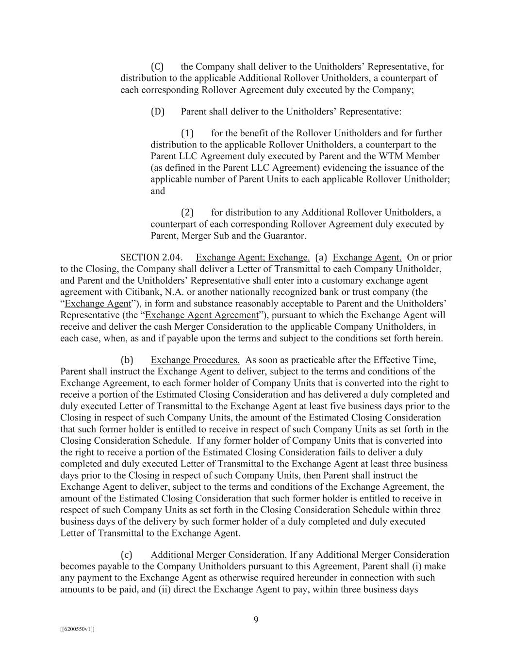 9 [[6200550v1]] the Company shall deliver to the Unitholders’ Representative, for distribution to the applicable Additional Rollover Unitholders, a counterpart of each corresponding Rollover Agreement duly executed by the Company; Parent shall deliver to the Unitholders’ Representative: for the benefit of the Rollover Unitholders and for further distribution to the applicable Rollover Unitholders, a counterpart to the Parent LLC Agreement duly executed by Parent and the WTM Member (as defined in the Parent LLC Agreement) evidencing the issuance of the applicable number of Parent Units to each applicable Rollover Unitholder; and for distribution to any Additional Rollover Unitholders, a counterpart of each corresponding Rollover Agreement duly executed by Parent, Merger Sub and the Guarantor. Exchange Agent; Exchange. Exchange Agent. On or prior to the Closing, the Company shall deliver a Letter of Transmittal to each Company Unitholder, and Parent and the Unitholders’ Representative shall enter into a customary exchange agent agreement with Citibank, N.A. or another nationally recognized bank or trust company (the “Exchange Agent”), in form and substance reasonably acceptable to Parent and the Unitholders’ Representative (the “Exchange Agent Agreement”), pursuant to which the Exchange Agent will receive and deliver the cash Merger Consideration to the applicable Company Unitholders, in each case, when, as and if payable upon the terms and subject to the conditions set forth herein. Exchange Procedures. As soon as practicable after the Effective Time, Parent shall instruct the Exchange Agent to deliver, subject to the terms and conditions of the Exchange Agreement, to each former holder of Company Units that is converted into the right to receive a portion of the Estimated Closing Consideration and has delivered a duly completed and duly executed Letter of Transmittal to the Exchange Agent at least five business days prior to the Closing in respect of such Company Units, the amount of the Estimated Closing Consideration that such former holder is entitled to receive in respect of such Company Units as set forth in the Closing Consideration Schedule. If any former holder of Company Units that is converted into the right to receive a portion of the Estimated Closing Consideration fails to deliver a duly completed and duly executed Letter of Transmittal to the Exchange Agent at least three business days prior to the Closing in respect of such Company Units, then Parent shall instruct the Exchange Agent to deliver, subject to the terms and conditions of the Exchange Agreement, the amount of the Estimated Closing Consideration that such former holder is entitled to receive in respect of such Company Units as set forth in the Closing Consideration Schedule within three business days of the delivery by such former holder of a duly completed and duly executed Letter of Transmittal to the Exchange Agent. Additional Merger Consideration. If any Additional Merger Consideration becomes payable to the Company Unitholders pursuant to this Agreement, Parent shall (i) make any payment to the Exchange Agent as otherwise required hereunder in connection with such amounts to be paid, and (ii) direct the Exchange Agent to pay, within three business days