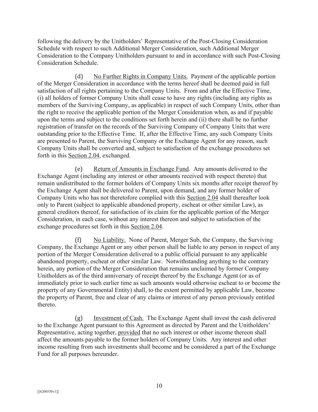 10 [[6200550v1]] following the delivery by the Unitholders’ Representative of the Post-Closing Consideration Schedule with respect to such Additional Merger Consideration, such Additional Merger Consideration to the Company Unitholders pursuant to and in accordance with such Post-Closing Consideration Schedule. No Further Rights in Company Units. Payment of the applicable portion of the Merger Consideration in accordance with the terms hereof shall be deemed paid in full satisfaction of all rights pertaining to the Company Units. From and after the Effective Time, (i) all holders of former Company Units shall cease to have any rights (including any rights as members of the Surviving Company, as applicable) in respect of such Company Units, other than the right to receive the applicable portion of the Merger Consideration when, as and if payable upon the terms and subject to the conditions set forth herein and (ii) there shall be no further registration of transfer on the records of the Surviving Company of Company Units that were outstanding prior to the Effective Time. If, after the Effective Time, any such Company Units are presented to Parent, the Surviving Company or the Exchange Agent for any reason, such Company Units shall be converted and, subject to satisfaction of the exchange procedures set forth in this Section 2.04, exchanged. Return of Amounts in Exchange Fund. Any amounts delivered to the Exchange Agent (including any interest or other amounts received with respect thereto) that remain undistributed to the former holders of Company Units six months after receipt thereof by the Exchange Agent shall be delivered to Parent, upon demand, and any former holder of Company Units who has not theretofore complied with this Section 2.04 shall thereafter look only to Parent (subject to applicable abandoned property, escheat or other similar Law), as general creditors thereof, for satisfaction of its claim for the applicable portion of the Merger Consideration, in each case, without any interest thereon and subject to satisfaction of the exchange procedures set forth in this Section 2.04. No Liability. None of Parent, Merger Sub, the Company, the Surviving Company, the Exchange Agent or any other person shall be liable to any person in respect of any portion of the Merger Consideration delivered to a public official pursuant to any applicable abandoned property, escheat or other similar Law. Notwithstanding anything to the contrary herein, any portion of the Merger Consideration that remains unclaimed by former Company Unitholders as of the third anniversary of receipt thereof by the Exchange Agent (or as of immediately prior to such earlier time as such amounts would otherwise escheat to or become the property of any Governmental Entity) shall, to the extent permitted by applicable Law, become the property of Parent, free and clear of any claims or interest of any person previously entitled thereto. Investment of Cash. The Exchange Agent shall invest the cash delivered to the Exchange Agent pursuant to this Agreement as directed by Parent and the Unitholders’ Representative, acting together, provided that no such interest or other income thereon shall affect the amounts payable to the former holders of Company Units. Any interest and other income resulting from such investments shall become and be considered a part of the Exchange Fund for all purposes hereunder.