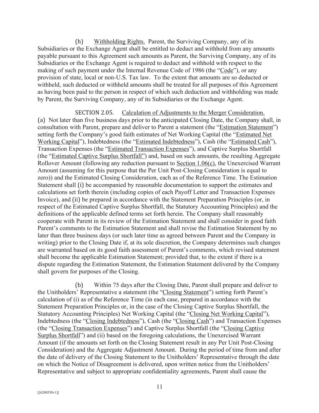 11 [[6200550v1]] Withholding Rights. Parent, the Surviving Company, any of its Subsidiaries or the Exchange Agent shall be entitled to deduct and withhold from any amounts payable pursuant to this Agreement such amounts as Parent, the Surviving Company, any of its Subsidiaries or the Exchange Agent is required to deduct and withhold with respect to the making of such payment under the Internal Revenue Code of 1986 (the “Code”), or any provision of state, local or non-U.S. Tax law. To the extent that amounts are so deducted or withheld, such deducted or withheld amounts shall be treated for all purposes of this Agreement as having been paid to the person in respect of which such deduction and withholding was made by Parent, the Surviving Company, any of its Subsidiaries or the Exchange Agent. Calculation of Adjustments to the Merger Consideration. Not later than five business days prior to the anticipated Closing Date, the Company shall, in consultation with Parent, prepare and deliver to Parent a statement (the “Estimation Statement”) setting forth the Company’s good faith estimates of Net Working Capital (the “Estimated Net Working Capital”), Indebtedness (the “Estimated Indebtedness”), Cash (the “Estimated Cash”), Transaction Expenses (the “Estimated Transaction Expenses”), and Captive Surplus Shortfall (the “Estimated Captive Surplus Shortfall”) and, based on such amounts, the resulting Aggregate Rollover Amount (following any reduction pursuant to Section 1.06(c), the Unexercised Warrant Amount (assuming for this purpose that the Per Unit Post-Closing Consideration is equal to zero)) and the Estimated Closing Consideration, each as of the Reference Time. The Estimation Statement shall be accompanied by reasonable documentation to support the estimates and calculations set forth therein (including copies of each Payoff Letter and Transaction Expenses Invoice), and be prepared in accordance with the Statement Preparation Principles (or, in respect of the Estimated Captive Surplus Shortfall, the Statutory Accounting Principles) and the definitions of the applicable defined terms set forth herein. The Company shall reasonably cooperate with Parent in its review of the Estimation Statement and shall consider in good faith Parent’s comments to the Estimation Statement and shall revise the Estimation Statement by no later than three business days (or such later time as agreed between Parent and the Company in writing) prior to the Closing Date if, at its sole discretion, the Company determines such changes are warranted based on its good faith assessment of Parent’s comments, which revised statement shall become the applicable Estimation Statement; provided that, to the extent if there is a dispute regarding the Estimation Statement, the Estimation Statement delivered by the Company shall govern for purposes of the Closing. Within 75 days after the Closing Date, Parent shall prepare and deliver to the Unitholders’ Representative a statement (the “Closing Statement”) setting forth Parent’s calculation of (i) as of the Reference Time (in each case, prepared in accordance with the Statement Preparation Principles or, in the case of the Closing Captive Surplus Shortfall, the Statutory Accounting Principles) Net Working Capital (the “Closing Net Working Capital”), Indebtedness (the “Closing Indebtedness”), Cash (the “Closing Cash”) and Transaction Expenses (the “Closing Transaction Expenses”) and Captive Surplus Shortfall (the “Closing Captive Surplus Shortfall”) and (ii) based on the foregoing calculations, the Unexercised Warrant Amount (if the amounts set forth on the Closing Statement result in any Per Unit Post-Closing Consideration) and the Aggregate Adjustment Amount. During the period of time from and after the date of delivery of the Closing Statement to the Unitholders’ Representative through the date on which the Notice of Disagreement is delivered, upon written notice from the Unitholders’ Representative and subject to appropriate confidentiality agreements, Parent shall cause the