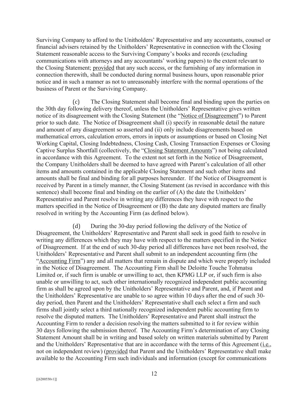 12 [[6200550v1]] Surviving Company to afford to the Unitholders’ Representative and any accountants, counsel or financial advisers retained by the Unitholders’ Representative in connection with the Closing Statement reasonable access to the Surviving Company’s books and records (excluding communications with attorneys and any accountants’ working papers) to the extent relevant to the Closing Statement; provided that any such access, or the furnishing of any information in connection therewith, shall be conducted during normal business hours, upon reasonable prior notice and in such a manner as not to unreasonably interfere with the normal operations of the business of Parent or the Surviving Company. The Closing Statement shall become final and binding upon the parties on the 30th day following delivery thereof, unless the Unitholders’ Representative gives written notice of its disagreement with the Closing Statement (the “Notice of Disagreement”) to Parent prior to such date. The Notice of Disagreement shall (i) specify in reasonable detail the nature and amount of any disagreement so asserted and (ii) only include disagreements based on mathematical errors, calculation errors, errors in inputs or assumptions or based on Closing Net Working Capital, Closing Indebtedness, Closing Cash, Closing Transaction Expenses or Closing Captive Surplus Shortfall (collectively, the “Closing Statement Amounts”) not being calculated in accordance with this Agreement. To the extent not set forth in the Notice of Disagreement, the Company Unitholders shall be deemed to have agreed with Parent’s calculation of all other items and amounts contained in the applicable Closing Statement and such other items and amounts shall be final and binding for all purposes hereunder. If the Notice of Disagreement is received by Parent in a timely manner, the Closing Statement (as revised in accordance with this sentence) shall become final and binding on the earlier of (A) the date the Unitholders’ Representative and Parent resolve in writing any differences they have with respect to the matters specified in the Notice of Disagreement or (B) the date any disputed matters are finally resolved in writing by the Accounting Firm (as defined below). During the 30-day period following the delivery of the Notice of Disagreement, the Unitholders’ Representative and Parent shall seek in good faith to resolve in writing any differences which they may have with respect to the matters specified in the Notice of Disagreement. If at the end of such 30-day period all differences have not been resolved, the Unitholders’ Representative and Parent shall submit to an independent accounting firm (the “Accounting Firm”) any and all matters that remain in dispute and which were properly included in the Notice of Disagreement. The Accounting Firm shall be Deloitte Touche Tohmatsu Limited or, if such firm is unable or unwilling to act, then KPMG LLP or, if such firm is also unable or unwilling to act, such other internationally recognized independent public accounting firm as shall be agreed upon by the Unitholders’ Representative and Parent, and, if Parent and the Unitholders’ Representative are unable to so agree within 10 days after the end of such 30- day period, then Parent and the Unitholders’ Representative shall each select a firm and such firms shall jointly select a third nationally recognized independent public accounting firm to resolve the disputed matters. The Unitholders’ Representative and Parent shall instruct the Accounting Firm to render a decision resolving the matters submitted to it for review within 30 days following the submission thereof. The Accounting Firm’s determination of any Closing Statement Amount shall be in writing and based solely on written materials submitted by Parent and the Unitholders’ Representative that are in accordance with the terms of this Agreement (i.e., not on independent review) (provided that Parent and the Unitholders’ Representative shall make available to the Accounting Firm such individuals and information (except for communications