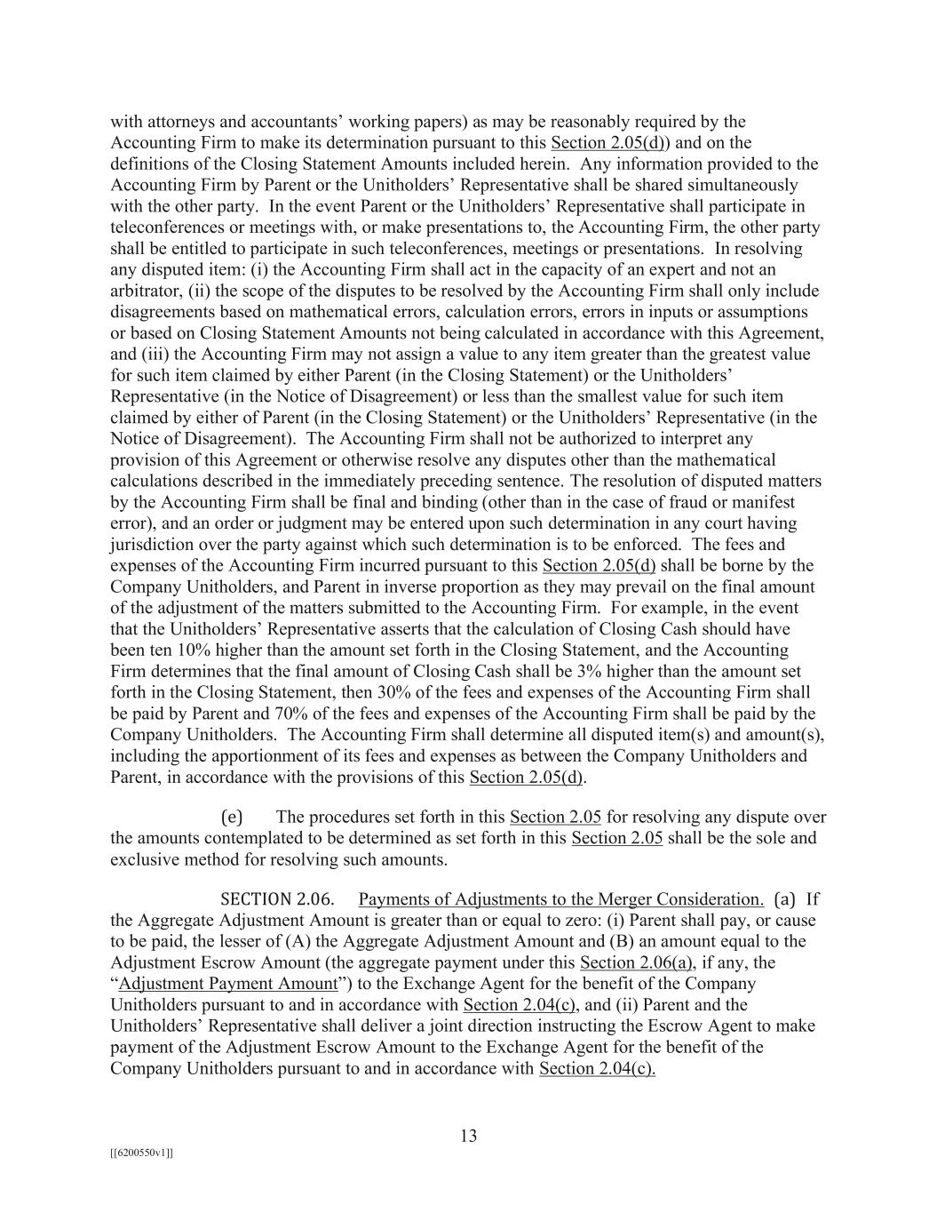 13 [[6200550v1]] with attorneys and accountants’ working papers) as may be reasonably required by the Accounting Firm to make its determination pursuant to this Section 2.05(d)) and on the definitions of the Closing Statement Amounts included herein. Any information provided to the Accounting Firm by Parent or the Unitholders’ Representative shall be shared simultaneously with the other party. In the event Parent or the Unitholders’ Representative shall participate in teleconferences or meetings with, or make presentations to, the Accounting Firm, the other party shall be entitled to participate in such teleconferences, meetings or presentations. In resolving any disputed item: (i) the Accounting Firm shall act in the capacity of an expert and not an arbitrator, (ii) the scope of the disputes to be resolved by the Accounting Firm shall only include disagreements based on mathematical errors, calculation errors, errors in inputs or assumptions or based on Closing Statement Amounts not being calculated in accordance with this Agreement, and (iii) the Accounting Firm may not assign a value to any item greater than the greatest value for such item claimed by either Parent (in the Closing Statement) or the Unitholders’ Representative (in the Notice of Disagreement) or less than the smallest value for such item claimed by either of Parent (in the Closing Statement) or the Unitholders’ Representative (in the Notice of Disagreement). The Accounting Firm shall not be authorized to interpret any provision of this Agreement or otherwise resolve any disputes other than the mathematical calculations described in the immediately preceding sentence. The resolution of disputed matters by the Accounting Firm shall be final and binding (other than in the case of fraud or manifest error), and an order or judgment may be entered upon such determination in any court having jurisdiction over the party against which such determination is to be enforced. The fees and expenses of the Accounting Firm incurred pursuant to this Section 2.05(d) shall be borne by the Company Unitholders, and Parent in inverse proportion as they may prevail on the final amount of the adjustment of the matters submitted to the Accounting Firm. For example, in the event that the Unitholders’ Representative asserts that the calculation of Closing Cash should have been ten 10% higher than the amount set forth in the Closing Statement, and the Accounting Firm determines that the final amount of Closing Cash shall be 3% higher than the amount set forth in the Closing Statement, then 30% of the fees and expenses of the Accounting Firm shall be paid by Parent and 70% of the fees and expenses of the Accounting Firm shall be paid by the Company Unitholders. The Accounting Firm shall determine all disputed item(s) and amount(s), including the apportionment of its fees and expenses as between the Company Unitholders and Parent, in accordance with the provisions of this Section 2.05(d). The procedures set forth in this Section 2.05 for resolving any dispute over the amounts contemplated to be determined as set forth in this Section 2.05 shall be the sole and exclusive method for resolving such amounts. Payments of Adjustments to the Merger Consideration. If the Aggregate Adjustment Amount is greater than or equal to zero: (i) Parent shall pay, or cause to be paid, the lesser of (A) the Aggregate Adjustment Amount and (B) an amount equal to the Adjustment Escrow Amount (the aggregate payment under this Section 2.06(a), if any, the “Adjustment Payment Amount”) to the Exchange Agent for the benefit of the Company Unitholders pursuant to and in accordance with Section 2.04(c), and (ii) Parent and the Unitholders’ Representative shall deliver a joint direction instructing the Escrow Agent to make payment of the Adjustment Escrow Amount to the Exchange Agent for the benefit of the Company Unitholders pursuant to and in accordance with Section 2.04(c).