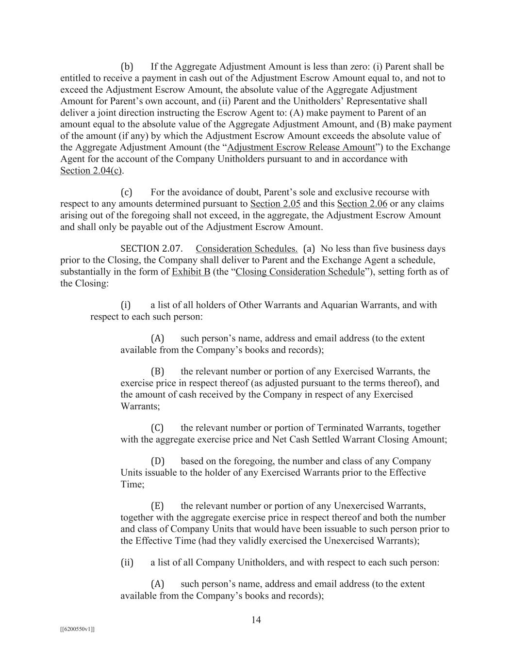 14 [[6200550v1]] If the Aggregate Adjustment Amount is less than zero: (i) Parent shall be entitled to receive a payment in cash out of the Adjustment Escrow Amount equal to, and not to exceed the Adjustment Escrow Amount, the absolute value of the Aggregate Adjustment Amount for Parent’s own account, and (ii) Parent and the Unitholders’ Representative shall deliver a joint direction instructing the Escrow Agent to: (A) make payment to Parent of an amount equal to the absolute value of the Aggregate Adjustment Amount, and (B) make payment of the amount (if any) by which the Adjustment Escrow Amount exceeds the absolute value of the Aggregate Adjustment Amount (the “Adjustment Escrow Release Amount”) to the Exchange Agent for the account of the Company Unitholders pursuant to and in accordance with Section 2.04(c). For the avoidance of doubt, Parent’s sole and exclusive recourse with respect to any amounts determined pursuant to Section 2.05 and this Section 2.06 or any claims arising out of the foregoing shall not exceed, in the aggregate, the Adjustment Escrow Amount and shall only be payable out of the Adjustment Escrow Amount. Consideration Schedules. No less than five business days prior to the Closing, the Company shall deliver to Parent and the Exchange Agent a schedule, substantially in the form of Exhibit B (the “Closing Consideration Schedule”), setting forth as of the Closing: a list of all holders of Other Warrants and Aquarian Warrants, and with respect to each such person: such person’s name, address and email address (to the extent available from the Company’s books and records); the relevant number or portion of any Exercised Warrants, the exercise price in respect thereof (as adjusted pursuant to the terms thereof), and the amount of cash received by the Company in respect of any Exercised Warrants; the relevant number or portion of Terminated Warrants, together with the aggregate exercise price and Net Cash Settled Warrant Closing Amount; based on the foregoing, the number and class of any Company Units issuable to the holder of any Exercised Warrants prior to the Effective Time; the relevant number or portion of any Unexercised Warrants, together with the aggregate exercise price in respect thereof and both the number and class of Company Units that would have been issuable to such person prior to the Effective Time (had they validly exercised the Unexercised Warrants); a list of all Company Unitholders, and with respect to each such person: such person’s name, address and email address (to the extent available from the Company’s books and records);
