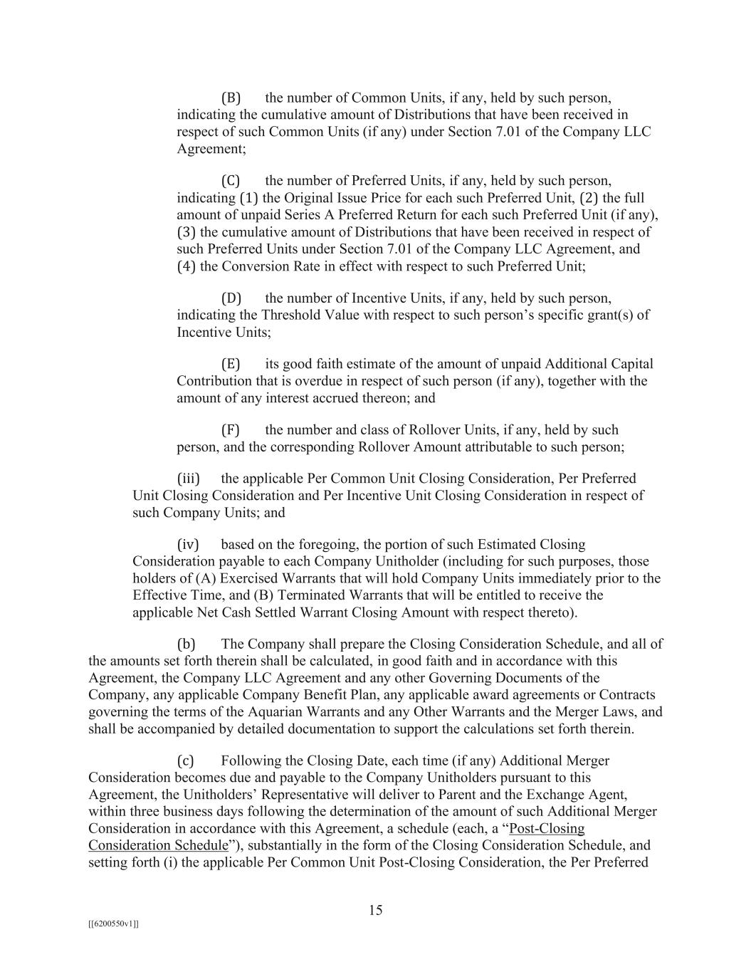 15 [[6200550v1]] the number of Common Units, if any, held by such person, indicating the cumulative amount of Distributions that have been received in respect of such Common Units (if any) under Section 7.01 of the Company LLC Agreement; the number of Preferred Units, if any, held by such person, indicating the Original Issue Price for each such Preferred Unit, the full amount of unpaid Series A Preferred Return for each such Preferred Unit (if any), the cumulative amount of Distributions that have been received in respect of such Preferred Units under Section 7.01 of the Company LLC Agreement, and the Conversion Rate in effect with respect to such Preferred Unit; the number of Incentive Units, if any, held by such person, indicating the Threshold Value with respect to such person’s specific grant(s) of Incentive Units; its good faith estimate of the amount of unpaid Additional Capital Contribution that is overdue in respect of such person (if any), together with the amount of any interest accrued thereon; and the number and class of Rollover Units, if any, held by such person, and the corresponding Rollover Amount attributable to such person; the applicable Per Common Unit Closing Consideration, Per Preferred Unit Closing Consideration and Per Incentive Unit Closing Consideration in respect of such Company Units; and based on the foregoing, the portion of such Estimated Closing Consideration payable to each Company Unitholder (including for such purposes, those holders of (A) Exercised Warrants that will hold Company Units immediately prior to the Effective Time, and (B) Terminated Warrants that will be entitled to receive the applicable Net Cash Settled Warrant Closing Amount with respect thereto). The Company shall prepare the Closing Consideration Schedule, and all of the amounts set forth therein shall be calculated, in good faith and in accordance with this Agreement, the Company LLC Agreement and any other Governing Documents of the Company, any applicable Company Benefit Plan, any applicable award agreements or Contracts governing the terms of the Aquarian Warrants and any Other Warrants and the Merger Laws, and shall be accompanied by detailed documentation to support the calculations set forth therein. Following the Closing Date, each time (if any) Additional Merger Consideration becomes due and payable to the Company Unitholders pursuant to this Agreement, the Unitholders’ Representative will deliver to Parent and the Exchange Agent, within three business days following the determination of the amount of such Additional Merger Consideration in accordance with this Agreement, a schedule (each, a “Post-Closing Consideration Schedule”), substantially in the form of the Closing Consideration Schedule, and setting forth (i) the applicable Per Common Unit Post-Closing Consideration, the Per Preferred