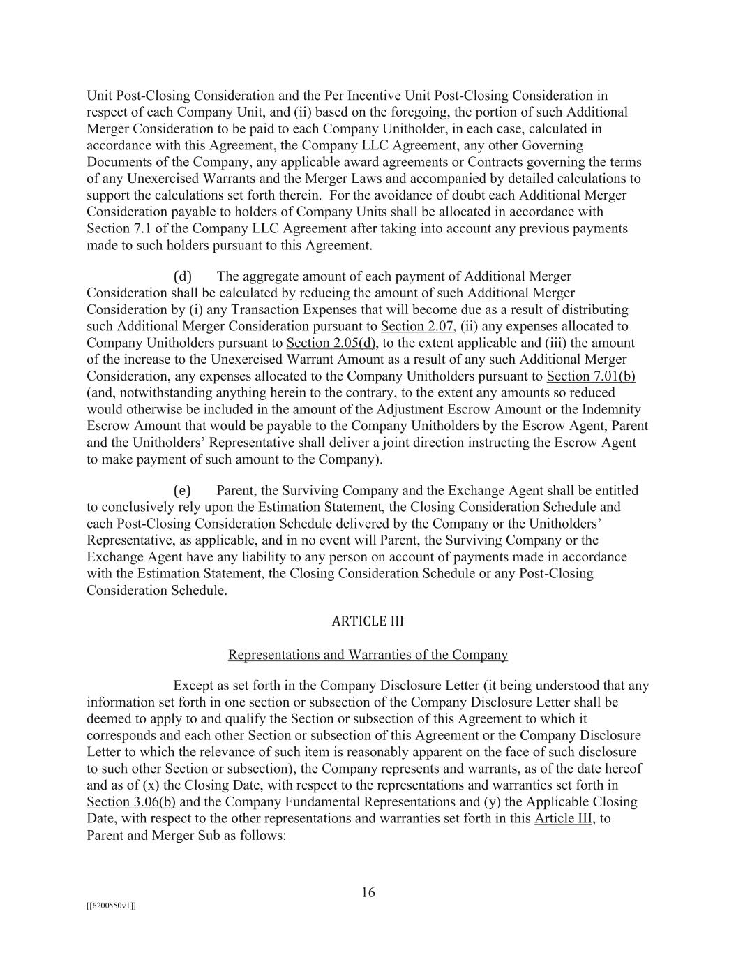 16 [[6200550v1]] Unit Post-Closing Consideration and the Per Incentive Unit Post-Closing Consideration in respect of each Company Unit, and (ii) based on the foregoing, the portion of such Additional Merger Consideration to be paid to each Company Unitholder, in each case, calculated in accordance with this Agreement, the Company LLC Agreement, any other Governing Documents of the Company, any applicable award agreements or Contracts governing the terms of any Unexercised Warrants and the Merger Laws and accompanied by detailed calculations to support the calculations set forth therein. For the avoidance of doubt each Additional Merger Consideration payable to holders of Company Units shall be allocated in accordance with Section 7.1 of the Company LLC Agreement after taking into account any previous payments made to such holders pursuant to this Agreement. The aggregate amount of each payment of Additional Merger Consideration shall be calculated by reducing the amount of such Additional Merger Consideration by (i) any Transaction Expenses that will become due as a result of distributing such Additional Merger Consideration pursuant to Section 2.07, (ii) any expenses allocated to Company Unitholders pursuant to Section 2.05(d), to the extent applicable and (iii) the amount of the increase to the Unexercised Warrant Amount as a result of any such Additional Merger Consideration, any expenses allocated to the Company Unitholders pursuant to Section 7.01(b) (and, notwithstanding anything herein to the contrary, to the extent any amounts so reduced would otherwise be included in the amount of the Adjustment Escrow Amount or the Indemnity Escrow Amount that would be payable to the Company Unitholders by the Escrow Agent, Parent and the Unitholders’ Representative shall deliver a joint direction instructing the Escrow Agent to make payment of such amount to the Company). Parent, the Surviving Company and the Exchange Agent shall be entitled to conclusively rely upon the Estimation Statement, the Closing Consideration Schedule and each Post-Closing Consideration Schedule delivered by the Company or the Unitholders’ Representative, as applicable, and in no event will Parent, the Surviving Company or the Exchange Agent have any liability to any person on account of payments made in accordance with the Estimation Statement, the Closing Consideration Schedule or any Post-Closing Consideration Schedule. Representations and Warranties of the Company Except as set forth in the Company Disclosure Letter (it being understood that any information set forth in one section or subsection of the Company Disclosure Letter shall be deemed to apply to and qualify the Section or subsection of this Agreement to which it corresponds and each other Section or subsection of this Agreement or the Company Disclosure Letter to which the relevance of such item is reasonably apparent on the face of such disclosure to such other Section or subsection), the Company represents and warrants, as of the date hereof and as of (x) the Closing Date, with respect to the representations and warranties set forth in Section 3.06(b) and the Company Fundamental Representations and (y) the Applicable Closing Date, with respect to the other representations and warranties set forth in this Article III, to Parent and Merger Sub as follows:
