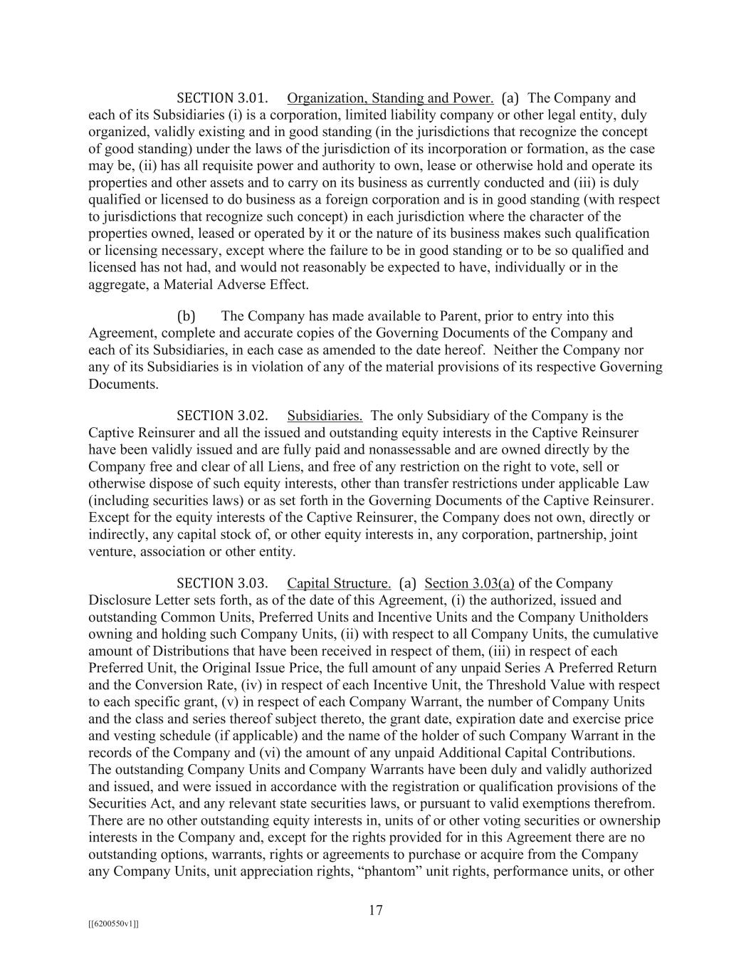 17 [[6200550v1]] Organization, Standing and Power. The Company and each of its Subsidiaries (i) is a corporation, limited liability company or other legal entity, duly organized, validly existing and in good standing (in the jurisdictions that recognize the concept of good standing) under the laws of the jurisdiction of its incorporation or formation, as the case may be, (ii) has all requisite power and authority to own, lease or otherwise hold and operate its properties and other assets and to carry on its business as currently conducted and (iii) is duly qualified or licensed to do business as a foreign corporation and is in good standing (with respect to jurisdictions that recognize such concept) in each jurisdiction where the character of the properties owned, leased or operated by it or the nature of its business makes such qualification or licensing necessary, except where the failure to be in good standing or to be so qualified and licensed has not had, and would not reasonably be expected to have, individually or in the aggregate, a Material Adverse Effect. The Company has made available to Parent, prior to entry into this Agreement, complete and accurate copies of the Governing Documents of the Company and each of its Subsidiaries, in each case as amended to the date hereof. Neither the Company nor any of its Subsidiaries is in violation of any of the material provisions of its respective Governing Documents. Subsidiaries. The only Subsidiary of the Company is the Captive Reinsurer and all the issued and outstanding equity interests in the Captive Reinsurer have been validly issued and are fully paid and nonassessable and are owned directly by the Company free and clear of all Liens, and free of any restriction on the right to vote, sell or otherwise dispose of such equity interests, other than transfer restrictions under applicable Law (including securities laws) or as set forth in the Governing Documents of the Captive Reinsurer. Except for the equity interests of the Captive Reinsurer, the Company does not own, directly or indirectly, any capital stock of, or other equity interests in, any corporation, partnership, joint venture, association or other entity. Capital Structure. Section 3.03(a) of the Company Disclosure Letter sets forth, as of the date of this Agreement, (i) the authorized, issued and outstanding Common Units, Preferred Units and Incentive Units and the Company Unitholders owning and holding such Company Units, (ii) with respect to all Company Units, the cumulative amount of Distributions that have been received in respect of them, (iii) in respect of each Preferred Unit, the Original Issue Price, the full amount of any unpaid Series A Preferred Return and the Conversion Rate, (iv) in respect of each Incentive Unit, the Threshold Value with respect to each specific grant, (v) in respect of each Company Warrant, the number of Company Units and the class and series thereof subject thereto, the grant date, expiration date and exercise price and vesting schedule (if applicable) and the name of the holder of such Company Warrant in the records of the Company and (vi) the amount of any unpaid Additional Capital Contributions. The outstanding Company Units and Company Warrants have been duly and validly authorized and issued, and were issued in accordance with the registration or qualification provisions of the Securities Act, and any relevant state securities laws, or pursuant to valid exemptions therefrom. There are no other outstanding equity interests in, units of or other voting securities or ownership interests in the Company and, except for the rights provided for in this Agreement there are no outstanding options, warrants, rights or agreements to purchase or acquire from the Company any Company Units, unit appreciation rights, “phantom” unit rights, performance units, or other