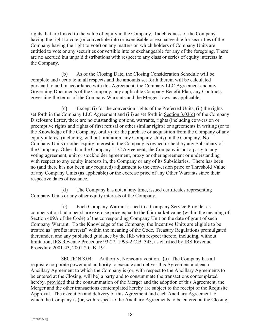 18 [[6200550v1]] rights that are linked to the value of equity in the Company, Indebtedness of the Company having the right to vote (or convertible into or exercisable or exchangeable for securities of the Company having the right to vote) on any matters on which holders of Company Units are entitled to vote or any securities convertible into or exchangeable for any of the foregoing. There are no accrued but unpaid distributions with respect to any class or series of equity interests in the Company. As of the Closing Date, the Closing Consideration Schedule will be complete and accurate in all respects and the amounts set forth therein will be calculated pursuant to and in accordance with this Agreement, the Company LLC Agreement and any Governing Documents of the Company, any applicable Company Benefit Plan, any Contracts governing the terms of the Company Warrants and the Merger Laws, as applicable. Except (i) for the conversion rights of the Preferred Units, (ii) the rights set forth in the Company LLC Agreement and (iii) as set forth in Section 3.03(c) of the Company Disclosure Letter, there are no outstanding options, warrants, rights (including conversion or preemptive rights and rights of first refusal or other similar rights) or agreements in writing (or to the Knowledge of the Company, orally) for the purchase or acquisition from the Company of any equity interest (including, without limitation, any Company Units) in the Company. No Company Units or other equity interest in the Company is owned or held by any Subsidiary of the Company. Other than the Company LLC Agreement, the Company is not a party to any voting agreement, unit or stockholder agreement, proxy or other agreement or understanding with respect to any equity interests in, the Company or any of its Subsidiaries. There has been no (and there has not been any required) adjustment to the conversion price or Threshold Value of any Company Units (as applicable) or the exercise price of any Other Warrants since their respective dates of issuance. The Company has not, at any time, issued certificates representing Company Units or any other equity interests of the Company. Each Company Warrant issued to a Company Service Provider as compensation had a per share exercise price equal to the fair market value (within the meaning of Section 409A of the Code) of the corresponding Company Unit on the date of grant of such Company Warrant. To the Knowledge of the Company, the Incentive Units are eligible to be treated as “profits interests” within the meaning of the Code, Treasury Regulations promulgated thereunder, and any published guidance by the IRS with respect thereto, including, without limitation, IRS Revenue Procedure 93-27, 1993-2 C.B. 343, as clarified by IRS Revenue Procedure 2001-43, 2001-2 C.B. 191. Authority; Noncontravention. The Company has all requisite corporate power and authority to execute and deliver this Agreement and each Ancillary Agreement to which the Company is (or, with respect to the Ancillary Agreements to be entered at the Closing, will be) a party and to consummate the transactions contemplated hereby, provided that the consummation of the Merger and the adoption of this Agreement, the Merger and the other transactions contemplated hereby are subject to the receipt of the Requisite Approval. The execution and delivery of this Agreement and each Ancillary Agreement to which the Company is (or, with respect to the Ancillary Agreements to be entered at the Closing,