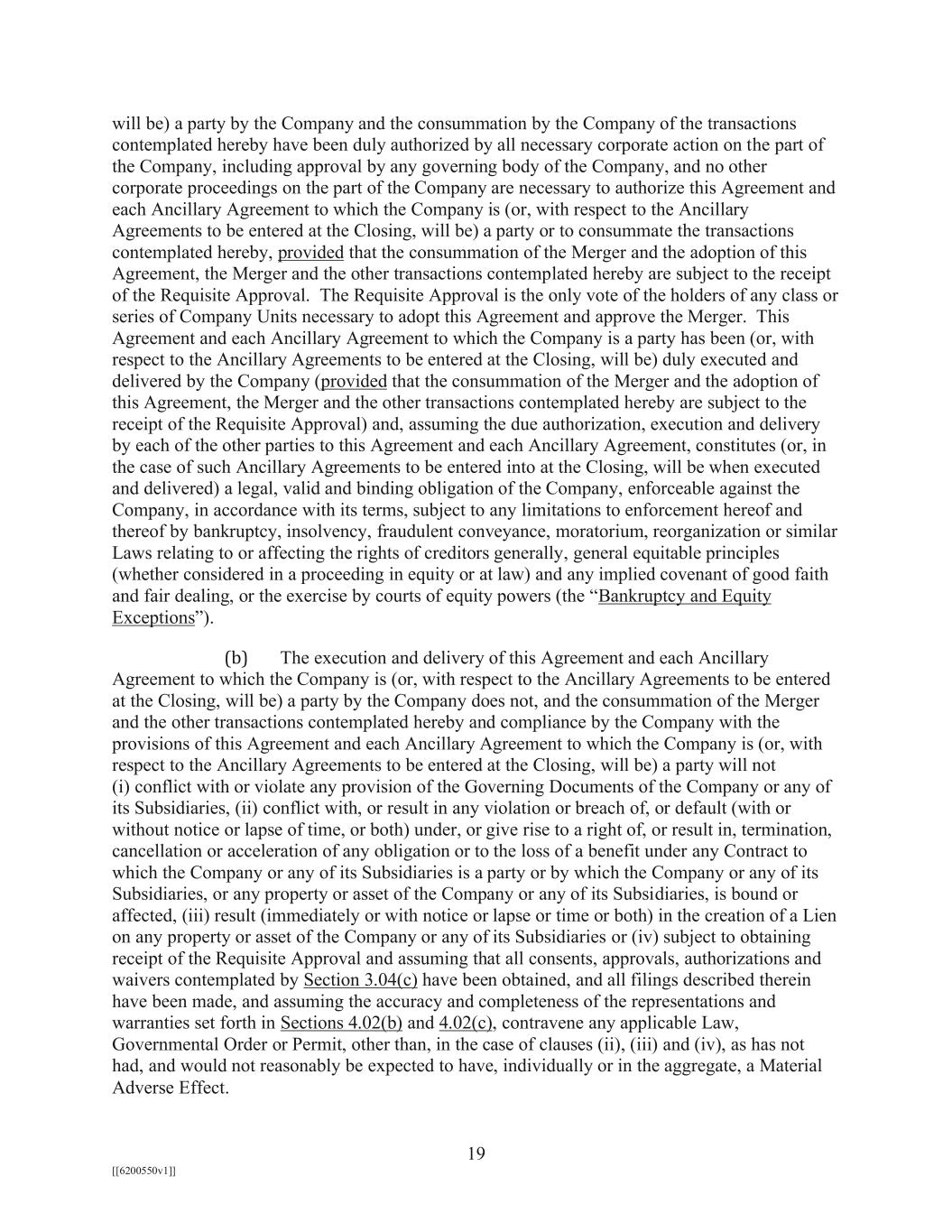 19 [[6200550v1]] will be) a party by the Company and the consummation by the Company of the transactions contemplated hereby have been duly authorized by all necessary corporate action on the part of the Company, including approval by any governing body of the Company, and no other corporate proceedings on the part of the Company are necessary to authorize this Agreement and each Ancillary Agreement to which the Company is (or, with respect to the Ancillary Agreements to be entered at the Closing, will be) a party or to consummate the transactions contemplated hereby, provided that the consummation of the Merger and the adoption of this Agreement, the Merger and the other transactions contemplated hereby are subject to the receipt of the Requisite Approval. The Requisite Approval is the only vote of the holders of any class or series of Company Units necessary to adopt this Agreement and approve the Merger. This Agreement and each Ancillary Agreement to which the Company is a party has been (or, with respect to the Ancillary Agreements to be entered at the Closing, will be) duly executed and delivered by the Company (provided that the consummation of the Merger and the adoption of this Agreement, the Merger and the other transactions contemplated hereby are subject to the receipt of the Requisite Approval) and, assuming the due authorization, execution and delivery by each of the other parties to this Agreement and each Ancillary Agreement, constitutes (or, in the case of such Ancillary Agreements to be entered into at the Closing, will be when executed and delivered) a legal, valid and binding obligation of the Company, enforceable against the Company, in accordance with its terms, subject to any limitations to enforcement hereof and thereof by bankruptcy, insolvency, fraudulent conveyance, moratorium, reorganization or similar Laws relating to or affecting the rights of creditors generally, general equitable principles (whether considered in a proceeding in equity or at law) and any implied covenant of good faith and fair dealing, or the exercise by courts of equity powers (the “Bankruptcy and Equity Exceptions”). The execution and delivery of this Agreement and each Ancillary Agreement to which the Company is (or, with respect to the Ancillary Agreements to be entered at the Closing, will be) a party by the Company does not, and the consummation of the Merger and the other transactions contemplated hereby and compliance by the Company with the provisions of this Agreement and each Ancillary Agreement to which the Company is (or, with respect to the Ancillary Agreements to be entered at the Closing, will be) a party will not (i) conflict with or violate any provision of the Governing Documents of the Company or any of its Subsidiaries, (ii) conflict with, or result in any violation or breach of, or default (with or without notice or lapse of time, or both) under, or give rise to a right of, or result in, termination, cancellation or acceleration of any obligation or to the loss of a benefit under any Contract to which the Company or any of its Subsidiaries is a party or by which the Company or any of its Subsidiaries, or any property or asset of the Company or any of its Subsidiaries, is bound or affected, (iii) result (immediately or with notice or lapse or time or both) in the creation of a Lien on any property or asset of the Company or any of its Subsidiaries or (iv) subject to obtaining receipt of the Requisite Approval and assuming that all consents, approvals, authorizations and waivers contemplated by Section 3.04(c) have been obtained, and all filings described therein have been made, and assuming the accuracy and completeness of the representations and warranties set forth in Sections 4.02(b) and 4.02(c), contravene any applicable Law, Governmental Order or Permit, other than, in the case of clauses (ii), (iii) and (iv), as has not had, and would not reasonably be expected to have, individually or in the aggregate, a Material Adverse Effect.