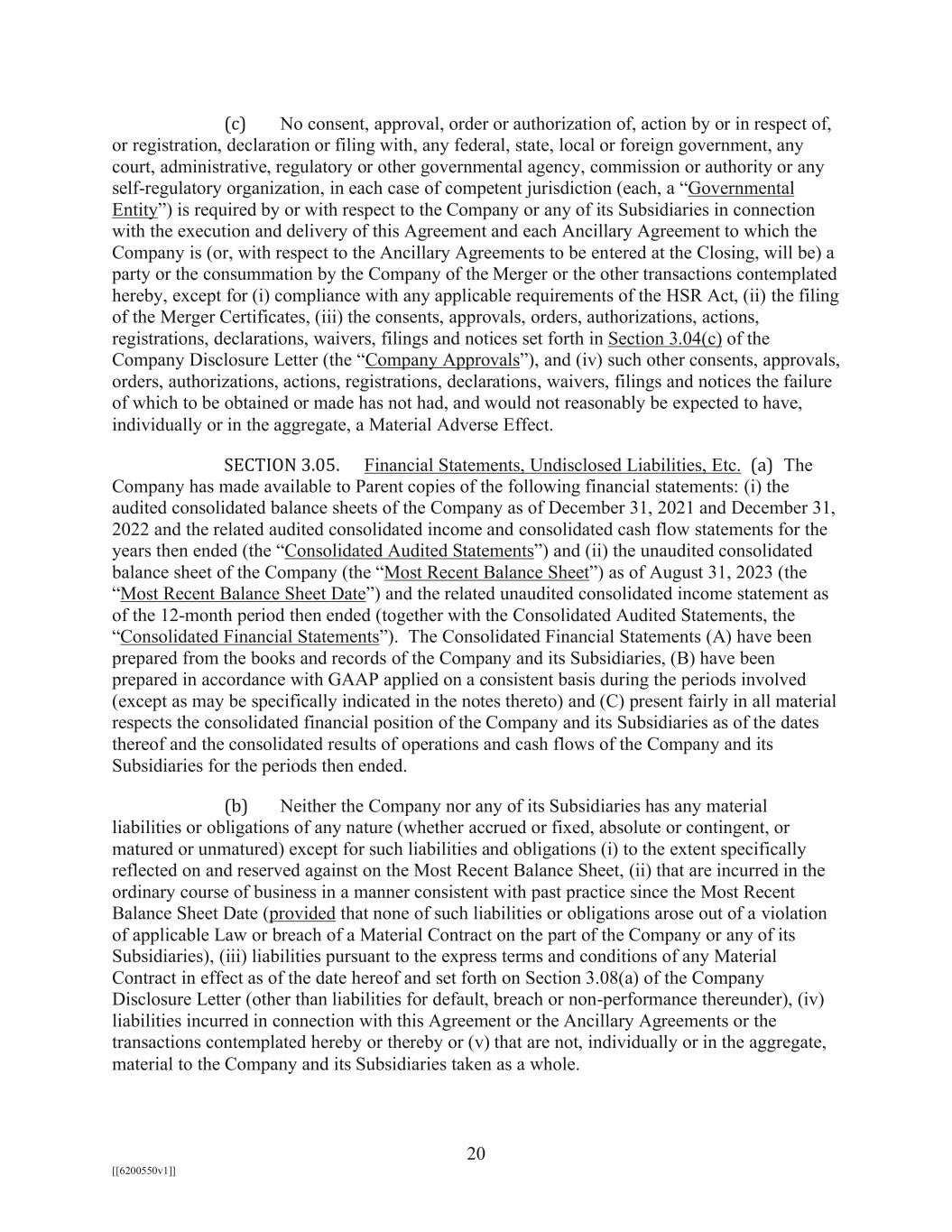 20 [[6200550v1]] No consent, approval, order or authorization of, action by or in respect of, or registration, declaration or filing with, any federal, state, local or foreign government, any court, administrative, regulatory or other governmental agency, commission or authority or any self-regulatory organization, in each case of competent jurisdiction (each, a “Governmental Entity”) is required by or with respect to the Company or any of its Subsidiaries in connection with the execution and delivery of this Agreement and each Ancillary Agreement to which the Company is (or, with respect to the Ancillary Agreements to be entered at the Closing, will be) a party or the consummation by the Company of the Merger or the other transactions contemplated hereby, except for (i) compliance with any applicable requirements of the HSR Act, (ii) the filing of the Merger Certificates, (iii) the consents, approvals, orders, authorizations, actions, registrations, declarations, waivers, filings and notices set forth in Section 3.04(c) of the Company Disclosure Letter (the “Company Approvals”), and (iv) such other consents, approvals, orders, authorizations, actions, registrations, declarations, waivers, filings and notices the failure of which to be obtained or made has not had, and would not reasonably be expected to have, individually or in the aggregate, a Material Adverse Effect. Financial Statements, Undisclosed Liabilities, Etc. The Company has made available to Parent copies of the following financial statements: (i) the audited consolidated balance sheets of the Company as of December 31, 2021 and December 31, 2022 and the related audited consolidated income and consolidated cash flow statements for the years then ended (the “Consolidated Audited Statements”) and (ii) the unaudited consolidated balance sheet of the Company (the “Most Recent Balance Sheet”) as of August 31, 2023 (the “Most Recent Balance Sheet Date”) and the related unaudited consolidated income statement as of the 12-month period then ended (together with the Consolidated Audited Statements, the “Consolidated Financial Statements”). The Consolidated Financial Statements (A) have been prepared from the books and records of the Company and its Subsidiaries, (B) have been prepared in accordance with GAAP applied on a consistent basis during the periods involved (except as may be specifically indicated in the notes thereto) and (C) present fairly in all material respects the consolidated financial position of the Company and its Subsidiaries as of the dates thereof and the consolidated results of operations and cash flows of the Company and its Subsidiaries for the periods then ended. Neither the Company nor any of its Subsidiaries has any material liabilities or obligations of any nature (whether accrued or fixed, absolute or contingent, or matured or unmatured) except for such liabilities and obligations (i) to the extent specifically reflected on and reserved against on the Most Recent Balance Sheet, (ii) that are incurred in the ordinary course of business in a manner consistent with past practice since the Most Recent Balance Sheet Date (provided that none of such liabilities or obligations arose out of a violation of applicable Law or breach of a Material Contract on the part of the Company or any of its Subsidiaries), (iii) liabilities pursuant to the express terms and conditions of any Material Contract in effect as of the date hereof and set forth on Section 3.08(a) of the Company Disclosure Letter (other than liabilities for default, breach or non-performance thereunder), (iv) liabilities incurred in connection with this Agreement or the Ancillary Agreements or the transactions contemplated hereby or thereby or (v) that are not, individually or in the aggregate, material to the Company and its Subsidiaries taken as a whole.