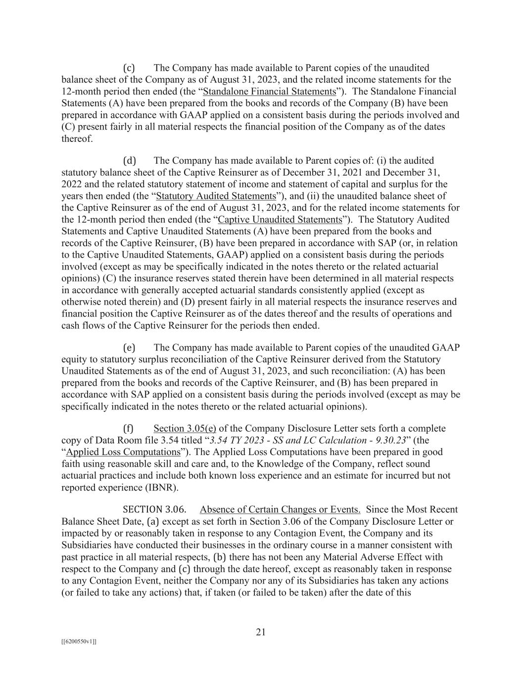 21 [[6200550v1]] The Company has made available to Parent copies of the unaudited balance sheet of the Company as of August 31, 2023, and the related income statements for the 12-month period then ended (the “Standalone Financial Statements”). The Standalone Financial Statements (A) have been prepared from the books and records of the Company (B) have been prepared in accordance with GAAP applied on a consistent basis during the periods involved and (C) present fairly in all material respects the financial position of the Company as of the dates thereof. The Company has made available to Parent copies of: (i) the audited statutory balance sheet of the Captive Reinsurer as of December 31, 2021 and December 31, 2022 and the related statutory statement of income and statement of capital and surplus for the years then ended (the “Statutory Audited Statements”), and (ii) the unaudited balance sheet of the Captive Reinsurer as of the end of August 31, 2023, and for the related income statements for the 12-month period then ended (the “Captive Unaudited Statements”). The Statutory Audited Statements and Captive Unaudited Statements (A) have been prepared from the books and records of the Captive Reinsurer, (B) have been prepared in accordance with SAP (or, in relation to the Captive Unaudited Statements, GAAP) applied on a consistent basis during the periods involved (except as may be specifically indicated in the notes thereto or the related actuarial opinions) (C) the insurance reserves stated therein have been determined in all material respects in accordance with generally accepted actuarial standards consistently applied (except as otherwise noted therein) and (D) present fairly in all material respects the insurance reserves and financial position the Captive Reinsurer as of the dates thereof and the results of operations and cash flows of the Captive Reinsurer for the periods then ended. The Company has made available to Parent copies of the unaudited GAAP equity to statutory surplus reconciliation of the Captive Reinsurer derived from the Statutory Unaudited Statements as of the end of August 31, 2023, and such reconciliation: (A) has been prepared from the books and records of the Captive Reinsurer, and (B) has been prepared in accordance with SAP applied on a consistent basis during the periods involved (except as may be specifically indicated in the notes thereto or the related actuarial opinions). Section 3.05(e) of the Company Disclosure Letter sets forth a complete copy of Data Room file 3.54 titled “3.54 TY 2023 - SS and LC Calculation - 9.30.23” (the “Applied Loss Computations”). The Applied Loss Computations have been prepared in good faith using reasonable skill and care and, to the Knowledge of the Company, reflect sound actuarial practices and include both known loss experience and an estimate for incurred but not reported experience (IBNR). Absence of Certain Changes or Events. Since the Most Recent Balance Sheet Date, except as set forth in Section 3.06 of the Company Disclosure Letter or impacted by or reasonably taken in response to any Contagion Event, the Company and its Subsidiaries have conducted their businesses in the ordinary course in a manner consistent with past practice in all material respects, there has not been any Material Adverse Effect with respect to the Company and through the date hereof, except as reasonably taken in response to any Contagion Event, neither the Company nor any of its Subsidiaries has taken any actions (or failed to take any actions) that, if taken (or failed to be taken) after the date of this