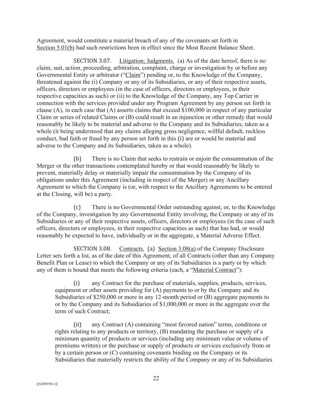 22 [[6200550v1]] Agreement, would constitute a material breach of any of the covenants set forth in Section 5.01(b) had such restrictions been in effect since the Most Recent Balance Sheet. Litigation; Judgments. (a) As of the date hereof, there is no claim, suit, action, proceeding, arbitration, complaint, charge or investigation by or before any Governmental Entity or arbitrator (“Claim”) pending or, to the Knowledge of the Company, threatened against the (i) Company or any of its Subsidiaries, or any of their respective assets, officers, directors or employees (in the case of officers, directors or employees, in their respective capacities as such) or (ii) to the Knowledge of the Company, any Top Carrier in connection with the services provided under any Program Agreement by any person set forth in clause (A), in each case that (A) asserts claims that exceed $100,000 in respect of any particular Claim or series of related Claims or (B) could result in an injunction or other remedy that would reasonably be likely to be material and adverse to the Company and its Subsidiaries, taken as a whole (it being understood that any claims alleging gross negligence, willful default, reckless conduct, bad faith or fraud by any person set forth in this are or would be material and adverse to the Company and its Subsidiaries, taken as a whole). There is no Claim that seeks to restrain or enjoin the consummation of the Merger or the other transactions contemplated hereby or that would reasonably be likely to prevent, materially delay or materially impair the consummation by the Company of its obligations under this Agreement (including in respect of the Merger) or any Ancillary Agreement to which the Company is (or, with respect to the Ancillary Agreements to be entered at the Closing, will be) a party. There is no Governmental Order outstanding against, or, to the Knowledge of the Company, investigation by any Governmental Entity involving, the Company or any of its Subsidiaries or any of their respective assets, officers, directors or employees (in the case of such officers, directors or employees, in their respective capacities as such) that has had, or would reasonably be expected to have, individually or in the aggregate, a Material Adverse Effect. Contracts. Section 3.08(a) of the Company Disclosure Letter sets forth a list, as of the date of this Agreement, of all Contracts (other than any Company Benefit Plan or Lease) to which the Company or any of its Subsidiaries is a party or by which any of them is bound that meets the following criteria (each, a “Material Contract”): any Contract for the purchase of materials, supplies, products, services, equipment or other assets providing for (A) payments to or by the Company and its Subsidiaries of $250,000 or more in any 12-month period or (B) aggregate payments to or by the Company and its Subsidiaries of $1,000,000 or more in the aggregate over the term of such Contract; any Contract (A) containing “most favored nation” terms, conditions or rights relating to any products or territory, (B) mandating the purchase or supply of a minimum quantity of products or services (including any minimum value or volume of premiums written) or the purchase or supply of products or services exclusively from or by a certain person or (C) containing covenants binding on the Company or its Subsidiaries that materially restricts the ability of the Company or any of its Subsidiaries