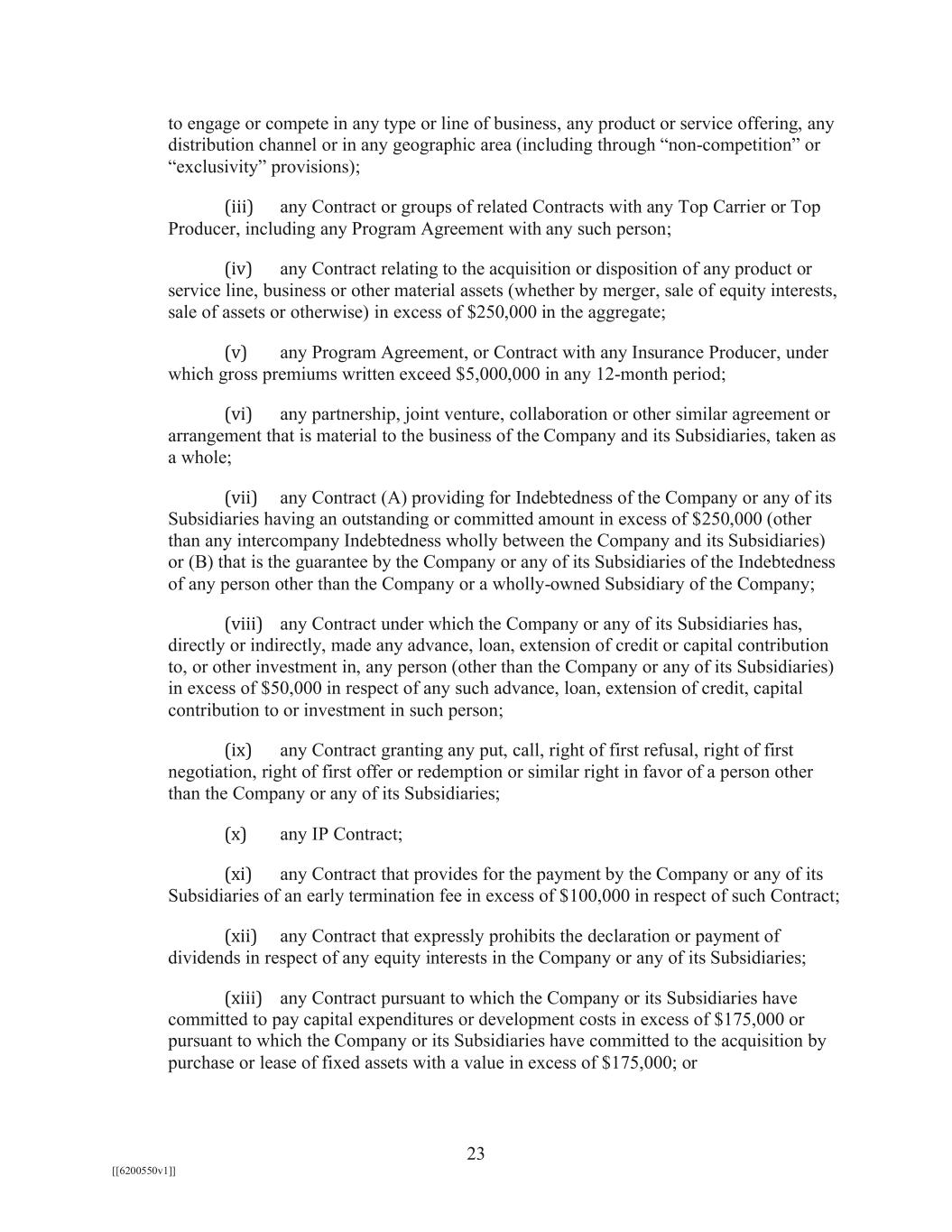 23 [[6200550v1]] to engage or compete in any type or line of business, any product or service offering, any distribution channel or in any geographic area (including through “non-competition” or “exclusivity” provisions); any Contract or groups of related Contracts with any Top Carrier or Top Producer, including any Program Agreement with any such person; any Contract relating to the acquisition or disposition of any product or service line, business or other material assets (whether by merger, sale of equity interests, sale of assets or otherwise) in excess of $250,000 in the aggregate; any Program Agreement, or Contract with any Insurance Producer, under which gross premiums written exceed $5,000,000 in any 12-month period; any partnership, joint venture, collaboration or other similar agreement or arrangement that is material to the business of the Company and its Subsidiaries, taken as a whole; any Contract (A) providing for Indebtedness of the Company or any of its Subsidiaries having an outstanding or committed amount in excess of $250,000 (other than any intercompany Indebtedness wholly between the Company and its Subsidiaries) or (B) that is the guarantee by the Company or any of its Subsidiaries of the Indebtedness of any person other than the Company or a wholly-owned Subsidiary of the Company; any Contract under which the Company or any of its Subsidiaries has, directly or indirectly, made any advance, loan, extension of credit or capital contribution to, or other investment in, any person (other than the Company or any of its Subsidiaries) in excess of $50,000 in respect of any such advance, loan, extension of credit, capital contribution to or investment in such person; any Contract granting any put, call, right of first refusal, right of first negotiation, right of first offer or redemption or similar right in favor of a person other than the Company or any of its Subsidiaries; any IP Contract; any Contract that provides for the payment by the Company or any of its Subsidiaries of an early termination fee in excess of $100,000 in respect of such Contract; any Contract that expressly prohibits the declaration or payment of dividends in respect of any equity interests in the Company or any of its Subsidiaries; any Contract pursuant to which the Company or its Subsidiaries have committed to pay capital expenditures or development costs in excess of $175,000 or pursuant to which the Company or its Subsidiaries have committed to the acquisition by purchase or lease of fixed assets with a value in excess of $175,000; or
