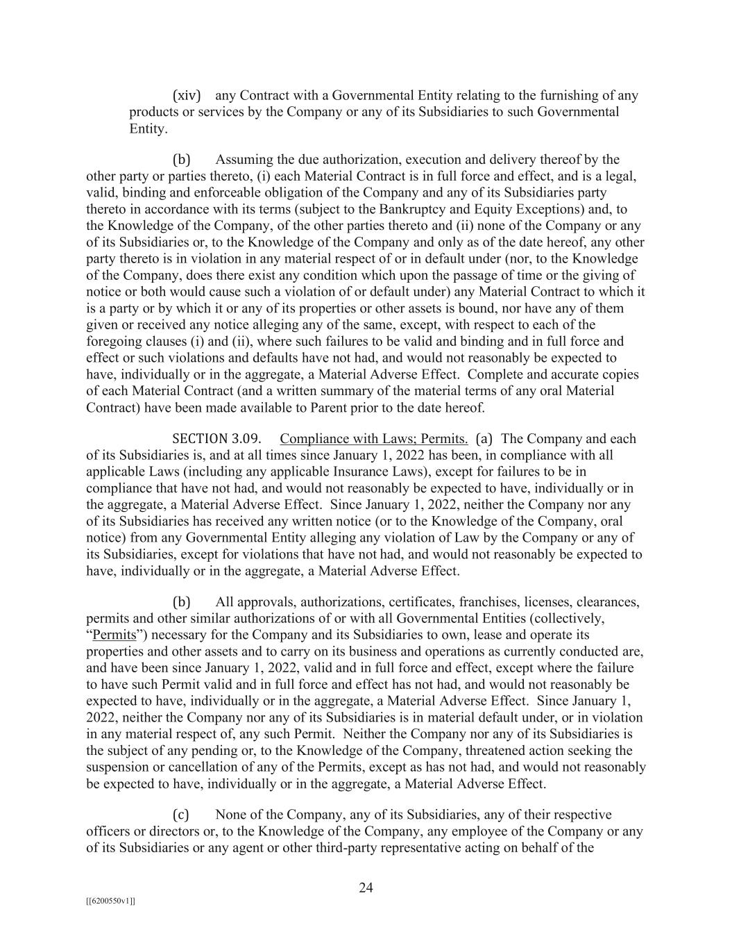 24 [[6200550v1]] any Contract with a Governmental Entity relating to the furnishing of any products or services by the Company or any of its Subsidiaries to such Governmental Entity. Assuming the due authorization, execution and delivery thereof by the other party or parties thereto, (i) each Material Contract is in full force and effect, and is a legal, valid, binding and enforceable obligation of the Company and any of its Subsidiaries party thereto in accordance with its terms (subject to the Bankruptcy and Equity Exceptions) and, to the Knowledge of the Company, of the other parties thereto and (ii) none of the Company or any of its Subsidiaries or, to the Knowledge of the Company and only as of the date hereof, any other party thereto is in violation in any material respect of or in default under (nor, to the Knowledge of the Company, does there exist any condition which upon the passage of time or the giving of notice or both would cause such a violation of or default under) any Material Contract to which it is a party or by which it or any of its properties or other assets is bound, nor have any of them given or received any notice alleging any of the same, except, with respect to each of the foregoing clauses (i) and (ii), where such failures to be valid and binding and in full force and effect or such violations and defaults have not had, and would not reasonably be expected to have, individually or in the aggregate, a Material Adverse Effect. Complete and accurate copies of each Material Contract (and a written summary of the material terms of any oral Material Contract) have been made available to Parent prior to the date hereof. Compliance with Laws; Permits. The Company and each of its Subsidiaries is, and at all times since January 1, 2022 has been, in compliance with all applicable Laws (including any applicable Insurance Laws), except for failures to be in compliance that have not had, and would not reasonably be expected to have, individually or in the aggregate, a Material Adverse Effect. Since January 1, 2022, neither the Company nor any of its Subsidiaries has received any written notice (or to the Knowledge of the Company, oral notice) from any Governmental Entity alleging any violation of Law by the Company or any of its Subsidiaries, except for violations that have not had, and would not reasonably be expected to have, individually or in the aggregate, a Material Adverse Effect. All approvals, authorizations, certificates, franchises, licenses, clearances, permits and other similar authorizations of or with all Governmental Entities (collectively, “Permits”) necessary for the Company and its Subsidiaries to own, lease and operate its properties and other assets and to carry on its business and operations as currently conducted are, and have been since January 1, 2022, valid and in full force and effect, except where the failure to have such Permit valid and in full force and effect has not had, and would not reasonably be expected to have, individually or in the aggregate, a Material Adverse Effect. Since January 1, 2022, neither the Company nor any of its Subsidiaries is in material default under, or in violation in any material respect of, any such Permit. Neither the Company nor any of its Subsidiaries is the subject of any pending or, to the Knowledge of the Company, threatened action seeking the suspension or cancellation of any of the Permits, except as has not had, and would not reasonably be expected to have, individually or in the aggregate, a Material Adverse Effect. None of the Company, any of its Subsidiaries, any of their respective officers or directors or, to the Knowledge of the Company, any employee of the Company or any of its Subsidiaries or any agent or other third-party representative acting on behalf of the