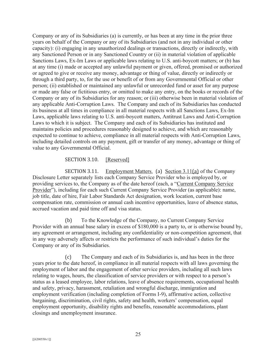 25 [[6200550v1]] Company or any of its Subsidiaries (a) is currently, or has been at any time in the prior three years on behalf of the Company or any of its Subsidiaries (and not in any individual or other capacity): (i) engaging in any unauthorized dealings or transactions, directly or indirectly, with any Sanctioned Person or in any Sanctioned Country or (ii) in material violation of applicable Sanctions Laws, Ex-Im Laws or applicable laws relating to U.S. anti-boycott matters; or (b) has at any time (i) made or accepted any unlawful payment or given, offered, promised or authorized or agreed to give or receive any money, advantage or thing of value, directly or indirectly or through a third party, to, for the use or benefit of or from any Governmental Official or other person; (ii) established or maintained any unlawful or unrecorded fund or asset for any purpose or made any false or fictitious entry, or omitted to make any entry, on the books or records of the Company or any of its Subsidiaries for any reason; or (iii) otherwise been in material violation of any applicable Anti-Corruption Laws. The Company and each of its Subsidiaries has conducted its business at all times in compliance in all material respects with all Sanctions Laws, Ex-Im Laws, applicable laws relating to U.S. anti-boycott matters, Antitrust Laws and Anti-Corruption Laws to which it is subject. The Company and each of its Subsidiaries has instituted and maintains policies and procedures reasonably designed to achieve, and which are reasonably expected to continue to achieve, compliance in all material respects with Anti-Corruption Laws, including detailed controls on any payment, gift or transfer of any money, advantage or thing of value to any Governmental Official. [Reserved] Employment Matters. Section 3.11 of the Company Disclosure Letter separately lists each Company Service Provider who is employed by, or providing services to, the Company as of the date hereof (each, a “Current Company Service Provider”), including for each such Current Company Service Provider (as applicable): name, job title, date of hire, Fair Labor Standards Act designation, work location, current base compensation rate, commission or annual cash incentive opportunities, leave of absence status, accrued vacation and paid time off and visa status. To the Knowledge of the Company, no Current Company Service Provider with an annual base salary in excess of $180,000 is a party to, or is otherwise bound by, any agreement or arrangement, including any confidentiality or non-competition agreement, that in any way adversely affects or restricts the performance of such individual’s duties for the Company or any of its Subsidiaries. The Company and each of its Subsidiaries is, and has been in the three years prior to the date hereof, in compliance in all material respects with all laws governing the employment of labor and the engagement of other service providers, including all such laws relating to wages, hours, the classification of service providers or with respect to a person’s status as a leased employee, labor relations, leave of absence requirements, occupational health and safety, privacy, harassment, retaliation and wrongful discharge, immigration and employment verification (including completion of Forms I-9), affirmative action, collective bargaining, discrimination, civil rights, safety and health, workers’ compensation, equal employment opportunity, disability rights and benefits, reasonable accommodations, plant closings and unemployment insurance.