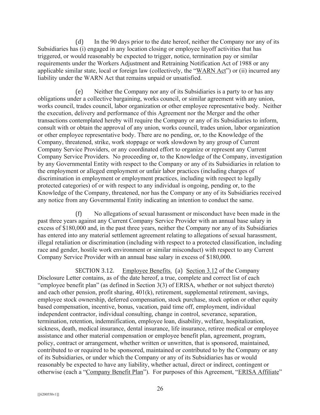 26 [[6200550v1]] In the 90 days prior to the date hereof, neither the Company nor any of its Subsidiaries has (i) engaged in any location closing or employee layoff activities that has triggered, or would reasonably be expected to trigger, notice, termination pay or similar requirements under the Workers Adjustment and Retraining Notification Act of 1988 or any applicable similar state, local or foreign law (collectively, the “WARN Act”) or (ii) incurred any liability under the WARN Act that remains unpaid or unsatisfied. Neither the Company nor any of its Subsidiaries is a party to or has any obligations under a collective bargaining, works council, or similar agreement with any union, works council, trades council, labor organization or other employee representative body. Neither the execution, delivery and performance of this Agreement nor the Merger and the other transactions contemplated hereby will require the Company or any of its Subsidiaries to inform, consult with or obtain the approval of any union, works council, trades union, labor organization or other employee representative body. There are no pending, or, to the Knowledge of the Company, threatened, strike, work stoppage or work slowdown by any group of Current Company Service Providers, or any coordinated effort to organize or represent any Current Company Service Providers. No proceeding or, to the Knowledge of the Company, investigation by any Governmental Entity with respect to the Company or any of its Subsidiaries in relation to the employment or alleged employment or unfair labor practices (including charges of discrimination in employment or employment practices, including with respect to legally protected categories) of or with respect to any individual is ongoing, pending or, to the Knowledge of the Company, threatened, nor has the Company or any of its Subsidiaries received any notice from any Governmental Entity indicating an intention to conduct the same. No allegations of sexual harassment or misconduct have been made in the past three years against any Current Company Service Provider with an annual base salary in excess of $180,000 and, in the past three years, neither the Company nor any of its Subsidiaries has entered into any material settlement agreement relating to allegations of sexual harassment, illegal retaliation or discrimination (including with respect to a protected classification, including race and gender, hostile work environment or similar misconduct) with respect to any Current Company Service Provider with an annual base salary in excess of $180,000. Employee Benefits. Section 3.12 of the Company Disclosure Letter contains, as of the date hereof, a true, complete and correct list of each “employee benefit plan” (as defined in Section 3(3) of ERISA, whether or not subject thereto) and each other pension, profit sharing, 401(k), retirement, supplemental retirement, savings, employee stock ownership, deferred compensation, stock purchase, stock option or other equity based compensation, incentive, bonus, vacation, paid time off, employment, individual independent contractor, individual consulting, change in control, severance, separation, termination, retention, indemnification, employee loan, disability, welfare, hospitalization, sickness, death, medical insurance, dental insurance, life insurance, retiree medical or employee assistance and other material compensation or employee benefit plan, agreement, program, policy, contract or arrangement, whether written or unwritten, that is sponsored, maintained, contributed to or required to be sponsored, maintained or contributed to by the Company or any of its Subsidiaries, or under which the Company or any of its Subsidiaries has or would reasonably be expected to have any liability, whether actual, direct or indirect, contingent or otherwise (each a “Company Benefit Plan”). For purposes of this Agreement, “ERISA Affiliate”