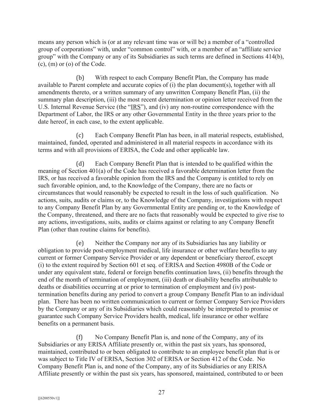 27 [[6200550v1]] means any person which is (or at any relevant time was or will be) a member of a “controlled group of corporations” with, under “common control” with, or a member of an “affiliate service group” with the Company or any of its Subsidiaries as such terms are defined in Sections 414(b), (c), (m) or (o) of the Code. With respect to each Company Benefit Plan, the Company has made available to Parent complete and accurate copies of (i) the plan document(s), together with all amendments thereto, or a written summary of any unwritten Company Benefit Plan, (ii) the summary plan description, (iii) the most recent determination or opinion letter received from the U.S. Internal Revenue Service (the “IRS”), and (iv) any non-routine correspondence with the Department of Labor, the IRS or any other Governmental Entity in the three years prior to the date hereof, in each case, to the extent applicable. Each Company Benefit Plan has been, in all material respects, established, maintained, funded, operated and administered in all material respects in accordance with its terms and with all provisions of ERISA, the Code and other applicable law. Each Company Benefit Plan that is intended to be qualified within the meaning of Section 401(a) of the Code has received a favorable determination letter from the IRS, or has received a favorable opinion from the IRS and the Company is entitled to rely on such favorable opinion, and, to the Knowledge of the Company, there are no facts or circumstances that would reasonably be expected to result in the loss of such qualification. No actions, suits, audits or claims or, to the Knowledge of the Company, investigations with respect to any Company Benefit Plan by any Governmental Entity are pending or, to the Knowledge of the Company, threatened, and there are no facts that reasonably would be expected to give rise to any actions, investigations, suits, audits or claims against or relating to any Company Benefit Plan (other than routine claims for benefits). Neither the Company nor any of its Subsidiaries has any liability or obligation to provide post-employment medical, life insurance or other welfare benefits to any current or former Company Service Provider or any dependent or beneficiary thereof, except (i) to the extent required by Section 601 et seq. of ERISA and Section 4980B of the Code or under any equivalent state, federal or foreign benefits continuation laws, (ii) benefits through the end of the month of termination of employment, (iii) death or disability benefits attributable to deaths or disabilities occurring at or prior to termination of employment and (iv) post- termination benefits during any period to convert a group Company Benefit Plan to an individual plan. There has been no written communication to current or former Company Service Providers by the Company or any of its Subsidiaries which could reasonably be interpreted to promise or guarantee such Company Service Providers health, medical, life insurance or other welfare benefits on a permanent basis. No Company Benefit Plan is, and none of the Company, any of its Subsidiaries or any ERISA Affiliate presently or, within the past six years, has sponsored, maintained, contributed to or been obligated to contribute to an employee benefit plan that is or was subject to Title IV of ERISA, Section 302 of ERISA or Section 412 of the Code. No Company Benefit Plan is, and none of the Company, any of its Subsidiaries or any ERISA Affiliate presently or within the past six years, has sponsored, maintained, contributed to or been