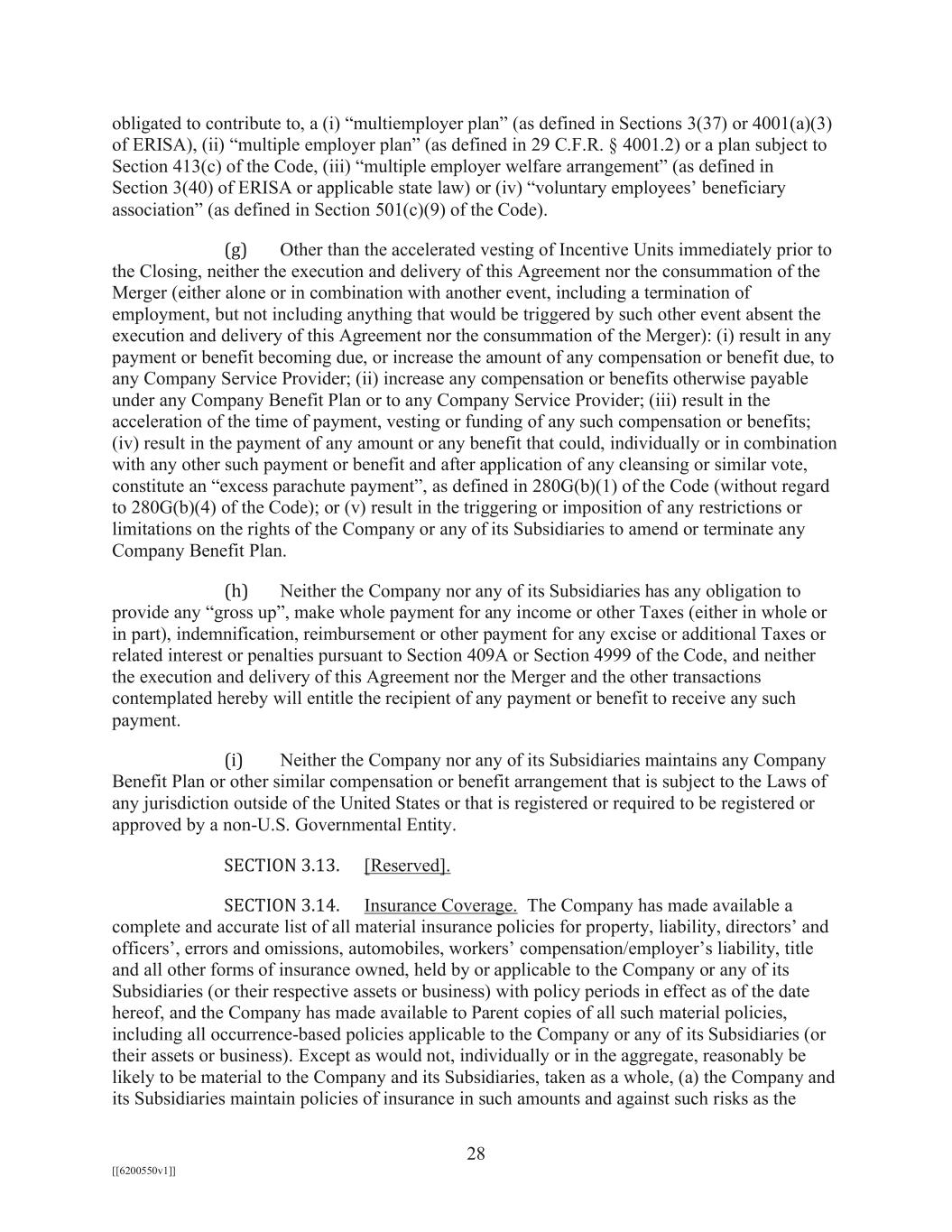28 [[6200550v1]] obligated to contribute to, a (i) “multiemployer plan” (as defined in Sections 3(37) or 4001(a)(3) of ERISA), (ii) “multiple employer plan” (as defined in 29 C.F.R. § 4001.2) or a plan subject to Section 413(c) of the Code, (iii) “multiple employer welfare arrangement” (as defined in Section 3(40) of ERISA or applicable state law) or (iv) “voluntary employees’ beneficiary association” (as defined in Section 501(c)(9) of the Code). Other than the accelerated vesting of Incentive Units immediately prior to the Closing, neither the execution and delivery of this Agreement nor the consummation of the Merger (either alone or in combination with another event, including a termination of employment, but not including anything that would be triggered by such other event absent the execution and delivery of this Agreement nor the consummation of the Merger): (i) result in any payment or benefit becoming due, or increase the amount of any compensation or benefit due, to any Company Service Provider; (ii) increase any compensation or benefits otherwise payable under any Company Benefit Plan or to any Company Service Provider; (iii) result in the acceleration of the time of payment, vesting or funding of any such compensation or benefits; (iv) result in the payment of any amount or any benefit that could, individually or in combination with any other such payment or benefit and after application of any cleansing or similar vote, constitute an “excess parachute payment”, as defined in 280G(b)(1) of the Code (without regard to 280G(b)(4) of the Code); or (v) result in the triggering or imposition of any restrictions or limitations on the rights of the Company or any of its Subsidiaries to amend or terminate any Company Benefit Plan. Neither the Company nor any of its Subsidiaries has any obligation to provide any “gross up”, make whole payment for any income or other Taxes (either in whole or in part), indemnification, reimbursement or other payment for any excise or additional Taxes or related interest or penalties pursuant to Section 409A or Section 4999 of the Code, and neither the execution and delivery of this Agreement nor the Merger and the other transactions contemplated hereby will entitle the recipient of any payment or benefit to receive any such payment. Neither the Company nor any of its Subsidiaries maintains any Company Benefit Plan or other similar compensation or benefit arrangement that is subject to the Laws of any jurisdiction outside of the United States or that is registered or required to be registered or approved by a non-U.S. Governmental Entity. [Reserved]. Insurance Coverage. The Company has made available a complete and accurate list of all material insurance policies for property, liability, directors’ and officers’, errors and omissions, automobiles, workers’ compensation/employer’s liability, title and all other forms of insurance owned, held by or applicable to the Company or any of its Subsidiaries (or their respective assets or business) with policy periods in effect as of the date hereof, and the Company has made available to Parent copies of all such material policies, including all occurrence-based policies applicable to the Company or any of its Subsidiaries (or their assets or business). Except as would not, individually or in the aggregate, reasonably be likely to be material to the Company and its Subsidiaries, taken as a whole, (a) the Company and its Subsidiaries maintain policies of insurance in such amounts and against such risks as the