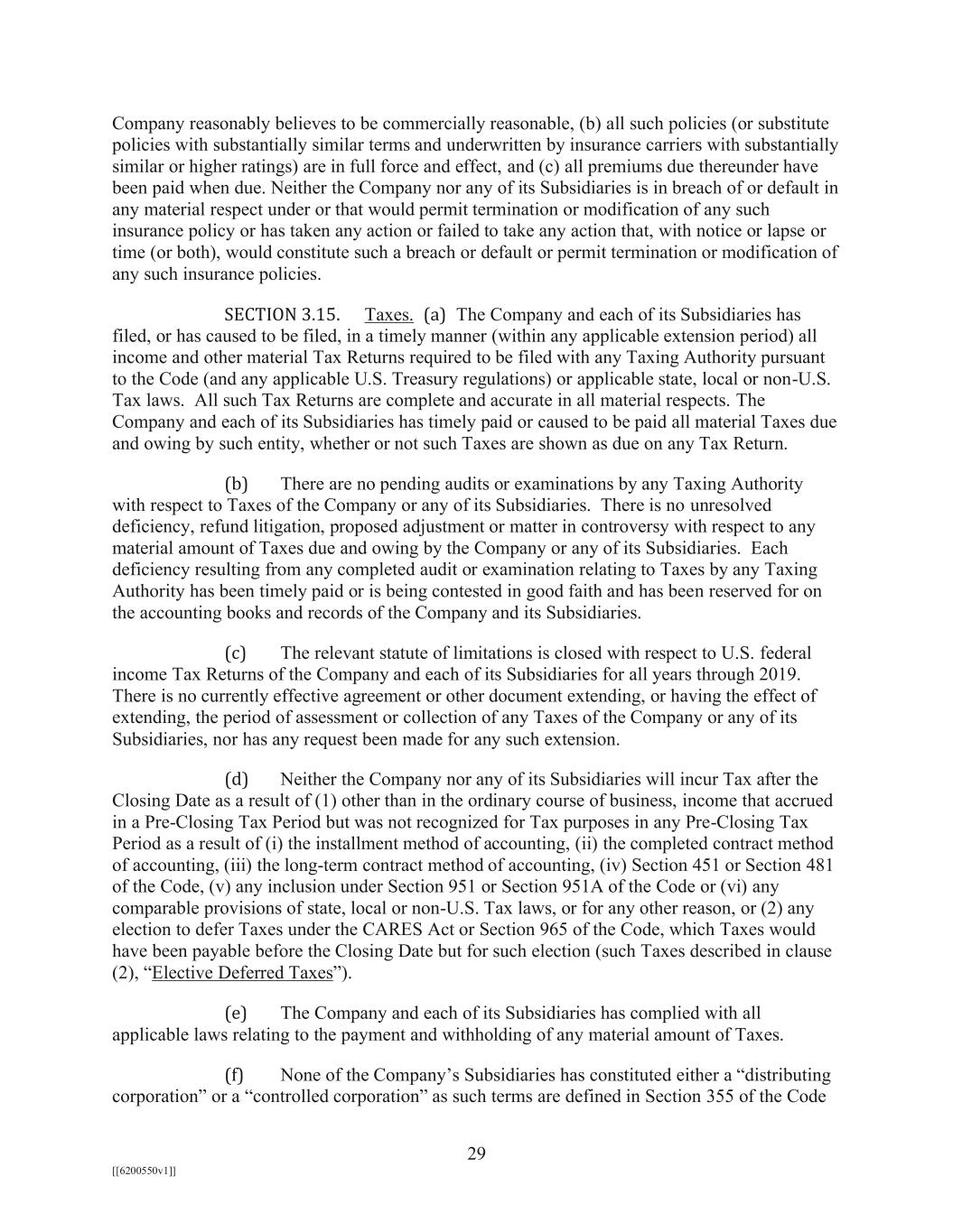 29 [[6200550v1]] Company reasonably believes to be commercially reasonable, (b) all such policies (or substitute policies with substantially similar terms and underwritten by insurance carriers with substantially similar or higher ratings) are in full force and effect, and (c) all premiums due thereunder have been paid when due. Neither the Company nor any of its Subsidiaries is in breach of or default in any material respect under or that would permit termination or modification of any such insurance policy or has taken any action or failed to take any action that, with notice or lapse or time (or both), would constitute such a breach or default or permit termination or modification of any such insurance policies. Taxes. The Company and each of its Subsidiaries has filed, or has caused to be filed, in a timely manner (within any applicable extension period) all income and other material Tax Returns required to be filed with any Taxing Authority pursuant to the Code (and any applicable U.S. Treasury regulations) or applicable state, local or non-U.S. Tax laws. All such Tax Returns are complete and accurate in all material respects. The Company and each of its Subsidiaries has timely paid or caused to be paid all material Taxes due and owing by such entity, whether or not such Taxes are shown as due on any Tax Return. There are no pending audits or examinations by any Taxing Authority with respect to Taxes of the Company or any of its Subsidiaries. There is no unresolved deficiency, refund litigation, proposed adjustment or matter in controversy with respect to any material amount of Taxes due and owing by the Company or any of its Subsidiaries. Each deficiency resulting from any completed audit or examination relating to Taxes by any Taxing Authority has been timely paid or is being contested in good faith and has been reserved for on the accounting books and records of the Company and its Subsidiaries. The relevant statute of limitations is closed with respect to U.S. federal income Tax Returns of the Company and each of its Subsidiaries for all years through 2019. There is no currently effective agreement or other document extending, or having the effect of extending, the period of assessment or collection of any Taxes of the Company or any of its Subsidiaries, nor has any request been made for any such extension. Neither the Company nor any of its Subsidiaries will incur Tax after the Closing Date as a result of (1) other than in the ordinary course of business, income that accrued in a Pre-Closing Tax Period but was not recognized for Tax purposes in any Pre-Closing Tax Period as a result of (i) the installment method of accounting, (ii) the completed contract method of accounting, (iii) the long-term contract method of accounting, (iv) Section 451 or Section 481 of the Code, (v) any inclusion under Section 951 or Section 951A of the Code or (vi) any comparable provisions of state, local or non-U.S. Tax laws, or for any other reason, or (2) any election to defer Taxes under the CARES Act or Section 965 of the Code, which Taxes would have been payable before the Closing Date but for such election (such Taxes described in clause (2), “Elective Deferred Taxes”). The Company and each of its Subsidiaries has complied with all applicable laws relating to the payment and withholding of any material amount of Taxes. None of the Company’s Subsidiaries has constituted either a “distributing corporation” or a “controlled corporation” as such terms are defined in Section 355 of the Code