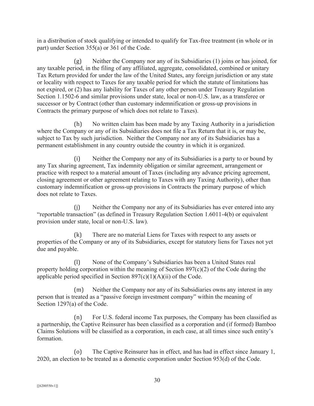 30 [[6200550v1]] in a distribution of stock qualifying or intended to qualify for Tax-free treatment (in whole or in part) under Section 355(a) or 361 of the Code. Neither the Company nor any of its Subsidiaries (1) joins or has joined, for any taxable period, in the filing of any affiliated, aggregate, consolidated, combined or unitary Tax Return provided for under the law of the United States, any foreign jurisdiction or any state or locality with respect to Taxes for any taxable period for which the statute of limitations has not expired, or (2) has any liability for Taxes of any other person under Treasury Regulation Section 1.1502-6 and similar provisions under state, local or non-U.S. law, as a transferee or successor or by Contract (other than customary indemnification or gross-up provisions in Contracts the primary purpose of which does not relate to Taxes). No written claim has been made by any Taxing Authority in a jurisdiction where the Company or any of its Subsidiaries does not file a Tax Return that it is, or may be, subject to Tax by such jurisdiction. Neither the Company nor any of its Subsidiaries has a permanent establishment in any country outside the country in which it is organized. Neither the Company nor any of its Subsidiaries is a party to or bound by any Tax sharing agreement, Tax indemnity obligation or similar agreement, arrangement or practice with respect to a material amount of Taxes (including any advance pricing agreement, closing agreement or other agreement relating to Taxes with any Taxing Authority), other than customary indemnification or gross-up provisions in Contracts the primary purpose of which does not relate to Taxes. Neither the Company nor any of its Subsidiaries has ever entered into any “reportable transaction” (as defined in Treasury Regulation Section 1.6011‑4(b) or equivalent provision under state, local or non-U.S. law). There are no material Liens for Taxes with respect to any assets or properties of the Company or any of its Subsidiaries, except for statutory liens for Taxes not yet due and payable. None of the Company’s Subsidiaries has been a United States real property holding corporation within the meaning of Section 897(c)(2) of the Code during the applicable period specified in Section 897(c)(1)(A)(ii) of the Code. Neither the Company nor any of its Subsidiaries owns any interest in any person that is treated as a “passive foreign investment company” within the meaning of Section 1297(a) of the Code. For U.S. federal income Tax purposes, the Company has been classified as a partnership, the Captive Reinsurer has been classified as a corporation and (if formed) Bamboo Claims Solutions will be classified as a corporation, in each case, at all times since such entity’s formation. The Captive Reinsurer has in effect, and has had in effect since January 1, 2020, an election to be treated as a domestic corporation under Section 953(d) of the Code.