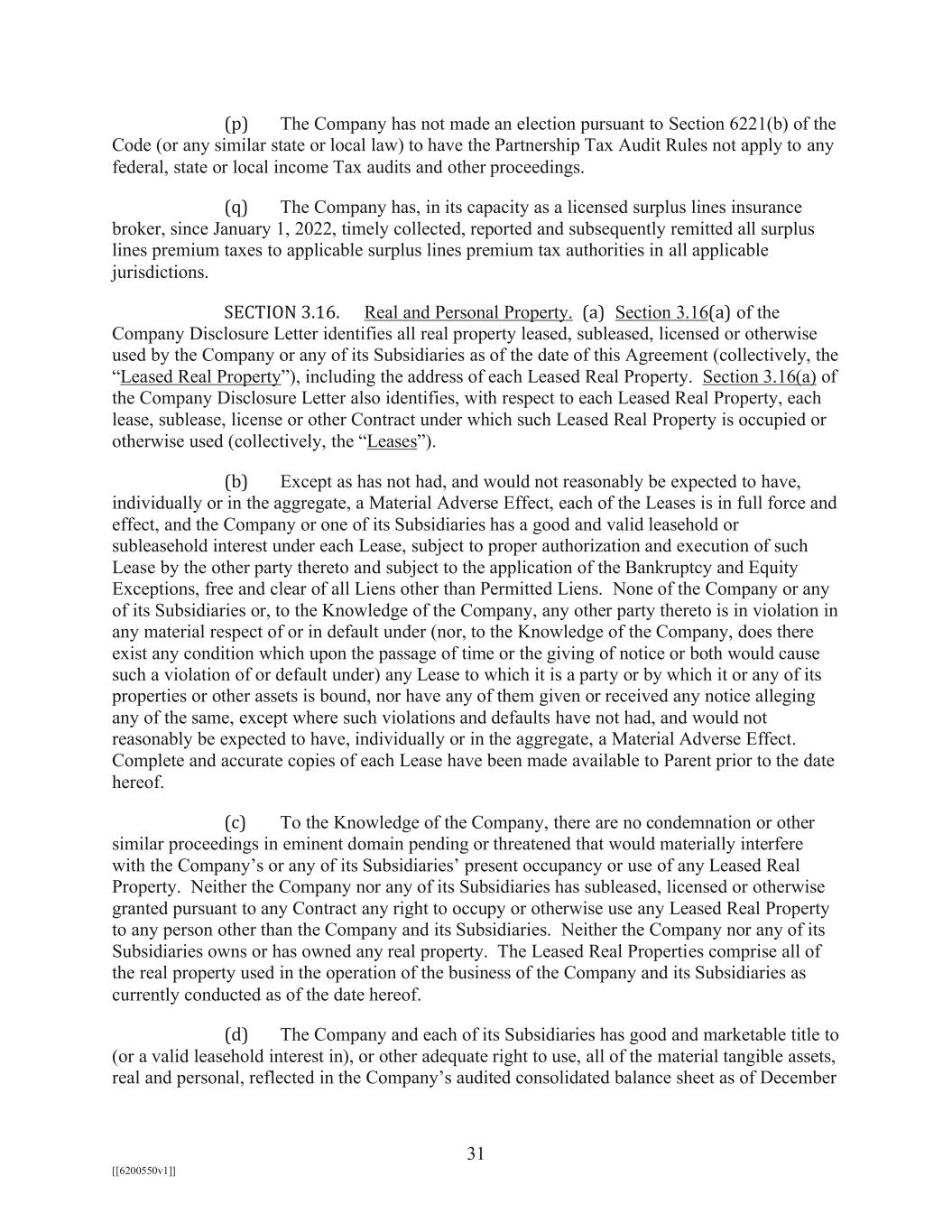31 [[6200550v1]] The Company has not made an election pursuant to Section 6221(b) of the Code (or any similar state or local law) to have the Partnership Tax Audit Rules not apply to any federal, state or local income Tax audits and other proceedings. The Company has, in its capacity as a licensed surplus lines insurance broker, since January 1, 2022, timely collected, reported and subsequently remitted all surplus lines premium taxes to applicable surplus lines premium tax authorities in all applicable jurisdictions. Real and Personal Property. Section 3.16 of the Company Disclosure Letter identifies all real property leased, subleased, licensed or otherwise used by the Company or any of its Subsidiaries as of the date of this Agreement (collectively, the “Leased Real Property”), including the address of each Leased Real Property. Section 3.16(a) of the Company Disclosure Letter also identifies, with respect to each Leased Real Property, each lease, sublease, license or other Contract under which such Leased Real Property is occupied or otherwise used (collectively, the “Leases”). Except as has not had, and would not reasonably be expected to have, individually or in the aggregate, a Material Adverse Effect, each of the Leases is in full force and effect, and the Company or one of its Subsidiaries has a good and valid leasehold or subleasehold interest under each Lease, subject to proper authorization and execution of such Lease by the other party thereto and subject to the application of the Bankruptcy and Equity Exceptions, free and clear of all Liens other than Permitted Liens. None of the Company or any of its Subsidiaries or, to the Knowledge of the Company, any other party thereto is in violation in any material respect of or in default under (nor, to the Knowledge of the Company, does there exist any condition which upon the passage of time or the giving of notice or both would cause such a violation of or default under) any Lease to which it is a party or by which it or any of its properties or other assets is bound, nor have any of them given or received any notice alleging any of the same, except where such violations and defaults have not had, and would not reasonably be expected to have, individually or in the aggregate, a Material Adverse Effect. Complete and accurate copies of each Lease have been made available to Parent prior to the date hereof. To the Knowledge of the Company, there are no condemnation or other similar proceedings in eminent domain pending or threatened that would materially interfere with the Company’s or any of its Subsidiaries’ present occupancy or use of any Leased Real Property. Neither the Company nor any of its Subsidiaries has subleased, licensed or otherwise granted pursuant to any Contract any right to occupy or otherwise use any Leased Real Property to any person other than the Company and its Subsidiaries. Neither the Company nor any of its Subsidiaries owns or has owned any real property. The Leased Real Properties comprise all of the real property used in the operation of the business of the Company and its Subsidiaries as currently conducted as of the date hereof. The Company and each of its Subsidiaries has good and marketable title to (or a valid leasehold interest in), or other adequate right to use, all of the material tangible assets, real and personal, reflected in the Company’s audited consolidated balance sheet as of December