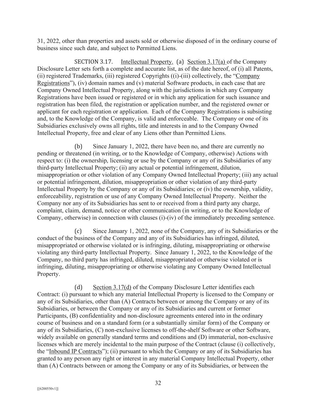 32 [[6200550v1]] 31, 2022, other than properties and assets sold or otherwise disposed of in the ordinary course of business since such date, and subject to Permitted Liens. Intellectual Property. Section 3.17(a) of the Company Disclosure Letter sets forth a complete and accurate list, as of the date hereof, of (i) all Patents, (ii) registered Trademarks, (iii) registered Copyrights ((i)-(iii) collectively, the “Company Registrations”), (iv) domain names and (v) material Software products, in each case that are Company Owned Intellectual Property, along with the jurisdictions in which any Company Registrations have been issued or registered or in which any application for such issuance and registration has been filed, the registration or application number, and the registered owner or applicant for each registration or application. Each of the Company Registrations is subsisting and, to the Knowledge of the Company, is valid and enforceable. The Company or one of its Subsidiaries exclusively owns all rights, title and interests in and to the Company Owned Intellectual Property, free and clear of any Liens other than Permitted Liens. Since January 1, 2022, there have been no, and there are currently no pending or threatened (in writing, or to the Knowledge of Company, otherwise) Actions with respect to: (i) the ownership, licensing or use by the Company or any of its Subsidiaries of any third-party Intellectual Property; (ii) any actual or potential infringement, dilution, misappropriation or other violation of any Company Owned Intellectual Property; (iii) any actual or potential infringement, dilution, misappropriation or other violation of any third-party Intellectual Property by the Company or any of its Subsidiaries; or (iv) the ownership, validity, enforceability, registration or use of any Company Owned Intellectual Property. Neither the Company nor any of its Subsidiaries has sent to or received from a third party any charge, complaint, claim, demand, notice or other communication (in writing, or to the Knowledge of Company, otherwise) in connection with clauses (i)-(iv) of the immediately preceding sentence. Since January 1, 2022, none of the Company, any of its Subsidiaries or the conduct of the business of the Company and any of its Subsidiaries has infringed, diluted, misappropriated or otherwise violated or is infringing, diluting, misappropriating or otherwise violating any third-party Intellectual Property. Since January 1, 2022, to the Knowledge of the Company, no third party has infringed, diluted, misappropriated or otherwise violated or is infringing, diluting, misappropriating or otherwise violating any Company Owned Intellectual Property. Section 3.17(d) of the Company Disclosure Letter identifies each Contract: (i) pursuant to which any material Intellectual Property is licensed to the Company or any of its Subsidiaries, other than (A) Contracts between or among the Company or any of its Subsidiaries, or between the Company or any of its Subsidiaries and current or former Participants, (B) confidentiality and non-disclosure agreements entered into in the ordinary course of business and on a standard form (or a substantially similar form) of the Company or any of its Subsidiaries, (C) non-exclusive licenses to off-the-shelf Software or other Software, widely available on generally standard terms and conditions and (D) immaterial, non-exclusive licenses which are merely incidental to the main purpose of the Contract (clause (i) collectively, the “Inbound IP Contracts”); (ii) pursuant to which the Company or any of its Subsidiaries has granted to any person any right or interest in any material Company Intellectual Property, other than (A) Contracts between or among the Company or any of its Subsidiaries, or between the