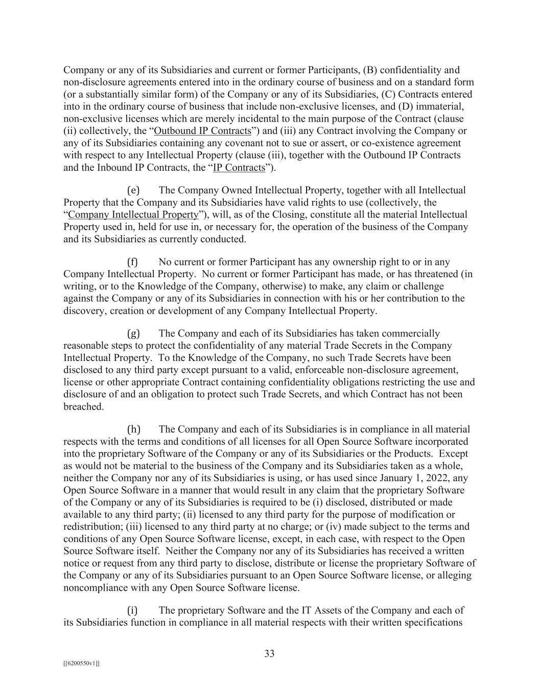 33 [[6200550v1]] Company or any of its Subsidiaries and current or former Participants, (B) confidentiality and non-disclosure agreements entered into in the ordinary course of business and on a standard form (or a substantially similar form) of the Company or any of its Subsidiaries, (C) Contracts entered into in the ordinary course of business that include non-exclusive licenses, and (D) immaterial, non-exclusive licenses which are merely incidental to the main purpose of the Contract (clause (ii) collectively, the “Outbound IP Contracts”) and (iii) any Contract involving the Company or any of its Subsidiaries containing any covenant not to sue or assert, or co-existence agreement with respect to any Intellectual Property (clause (iii), together with the Outbound IP Contracts and the Inbound IP Contracts, the “IP Contracts”). The Company Owned Intellectual Property, together with all Intellectual Property that the Company and its Subsidiaries have valid rights to use (collectively, the “Company Intellectual Property”), will, as of the Closing, constitute all the material Intellectual Property used in, held for use in, or necessary for, the operation of the business of the Company and its Subsidiaries as currently conducted. No current or former Participant has any ownership right to or in any Company Intellectual Property. No current or former Participant has made, or has threatened (in writing, or to the Knowledge of the Company, otherwise) to make, any claim or challenge against the Company or any of its Subsidiaries in connection with his or her contribution to the discovery, creation or development of any Company Intellectual Property. The Company and each of its Subsidiaries has taken commercially reasonable steps to protect the confidentiality of any material Trade Secrets in the Company Intellectual Property. To the Knowledge of the Company, no such Trade Secrets have been disclosed to any third party except pursuant to a valid, enforceable non-disclosure agreement, license or other appropriate Contract containing confidentiality obligations restricting the use and disclosure of and an obligation to protect such Trade Secrets, and which Contract has not been breached. The Company and each of its Subsidiaries is in compliance in all material respects with the terms and conditions of all licenses for all Open Source Software incorporated into the proprietary Software of the Company or any of its Subsidiaries or the Products. Except as would not be material to the business of the Company and its Subsidiaries taken as a whole, neither the Company nor any of its Subsidiaries is using, or has used since January 1, 2022, any Open Source Software in a manner that would result in any claim that the proprietary Software of the Company or any of its Subsidiaries is required to be (i) disclosed, distributed or made available to any third party; (ii) licensed to any third party for the purpose of modification or redistribution; (iii) licensed to any third party at no charge; or (iv) made subject to the terms and conditions of any Open Source Software license, except, in each case, with respect to the Open Source Software itself. Neither the Company nor any of its Subsidiaries has received a written notice or request from any third party to disclose, distribute or license the proprietary Software of the Company or any of its Subsidiaries pursuant to an Open Source Software license, or alleging noncompliance with any Open Source Software license. The proprietary Software and the IT Assets of the Company and each of its Subsidiaries function in compliance in all material respects with their written specifications