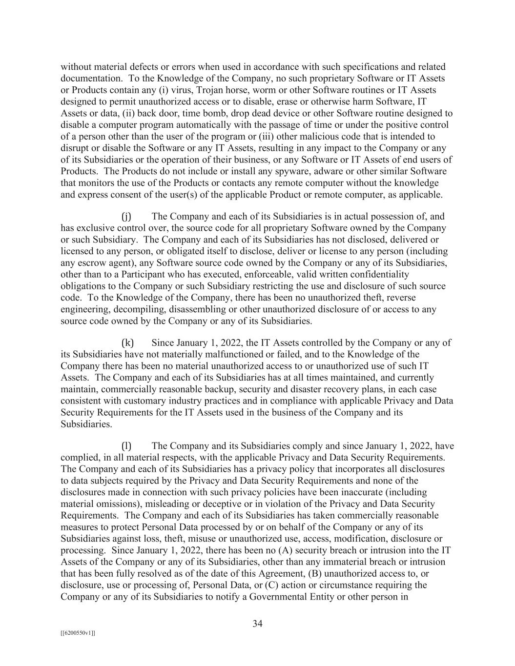 34 [[6200550v1]] without material defects or errors when used in accordance with such specifications and related documentation. To the Knowledge of the Company, no such proprietary Software or IT Assets or Products contain any (i) virus, Trojan horse, worm or other Software routines or IT Assets designed to permit unauthorized access or to disable, erase or otherwise harm Software, IT Assets or data, (ii) back door, time bomb, drop dead device or other Software routine designed to disable a computer program automatically with the passage of time or under the positive control of a person other than the user of the program or (iii) other malicious code that is intended to disrupt or disable the Software or any IT Assets, resulting in any impact to the Company or any of its Subsidiaries or the operation of their business, or any Software or IT Assets of end users of Products. The Products do not include or install any spyware, adware or other similar Software that monitors the use of the Products or contacts any remote computer without the knowledge and express consent of the user(s) of the applicable Product or remote computer, as applicable. The Company and each of its Subsidiaries is in actual possession of, and has exclusive control over, the source code for all proprietary Software owned by the Company or such Subsidiary. The Company and each of its Subsidiaries has not disclosed, delivered or licensed to any person, or obligated itself to disclose, deliver or license to any person (including any escrow agent), any Software source code owned by the Company or any of its Subsidiaries, other than to a Participant who has executed, enforceable, valid written confidentiality obligations to the Company or such Subsidiary restricting the use and disclosure of such source code. To the Knowledge of the Company, there has been no unauthorized theft, reverse engineering, decompiling, disassembling or other unauthorized disclosure of or access to any source code owned by the Company or any of its Subsidiaries. Since January 1, 2022, the IT Assets controlled by the Company or any of its Subsidiaries have not materially malfunctioned or failed, and to the Knowledge of the Company there has been no material unauthorized access to or unauthorized use of such IT Assets. The Company and each of its Subsidiaries has at all times maintained, and currently maintain, commercially reasonable backup, security and disaster recovery plans, in each case consistent with customary industry practices and in compliance with applicable Privacy and Data Security Requirements for the IT Assets used in the business of the Company and its Subsidiaries. The Company and its Subsidiaries comply and since January 1, 2022, have complied, in all material respects, with the applicable Privacy and Data Security Requirements. The Company and each of its Subsidiaries has a privacy policy that incorporates all disclosures to data subjects required by the Privacy and Data Security Requirements and none of the disclosures made in connection with such privacy policies have been inaccurate (including material omissions), misleading or deceptive or in violation of the Privacy and Data Security Requirements. The Company and each of its Subsidiaries has taken commercially reasonable measures to protect Personal Data processed by or on behalf of the Company or any of its Subsidiaries against loss, theft, misuse or unauthorized use, access, modification, disclosure or processing. Since January 1, 2022, there has been no (A) security breach or intrusion into the IT Assets of the Company or any of its Subsidiaries, other than any immaterial breach or intrusion that has been fully resolved as of the date of this Agreement, (B) unauthorized access to, or disclosure, use or processing of, Personal Data, or (C) action or circumstance requiring the Company or any of its Subsidiaries to notify a Governmental Entity or other person in