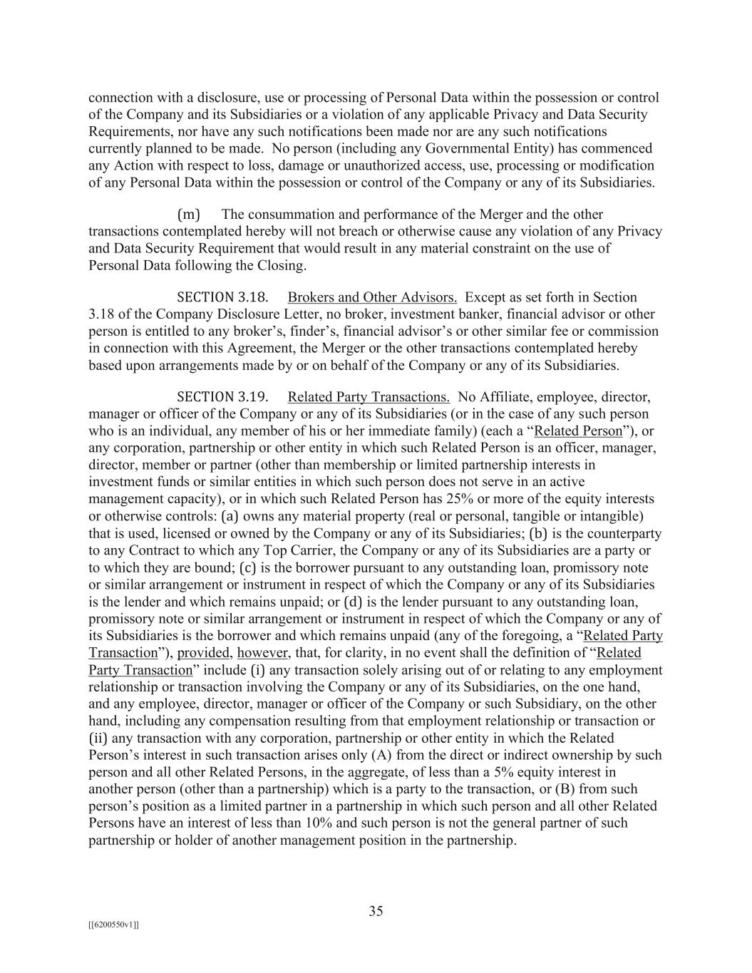 35 [[6200550v1]] connection with a disclosure, use or processing of Personal Data within the possession or control of the Company and its Subsidiaries or a violation of any applicable Privacy and Data Security Requirements, nor have any such notifications been made nor are any such notifications currently planned to be made. No person (including any Governmental Entity) has commenced any Action with respect to loss, damage or unauthorized access, use, processing or modification of any Personal Data within the possession or control of the Company or any of its Subsidiaries. The consummation and performance of the Merger and the other transactions contemplated hereby will not breach or otherwise cause any violation of any Privacy and Data Security Requirement that would result in any material constraint on the use of Personal Data following the Closing. Brokers and Other Advisors. Except as set forth in Section 3.18 of the Company Disclosure Letter, no broker, investment banker, financial advisor or other person is entitled to any broker’s, finder’s, financial advisor’s or other similar fee or commission in connection with this Agreement, the Merger or the other transactions contemplated hereby based upon arrangements made by or on behalf of the Company or any of its Subsidiaries. Related Party Transactions. No Affiliate, employee, director, manager or officer of the Company or any of its Subsidiaries (or in the case of any such person who is an individual, any member of his or her immediate family) (each a “Related Person”), or any corporation, partnership or other entity in which such Related Person is an officer, manager, director, member or partner (other than membership or limited partnership interests in investment funds or similar entities in which such person does not serve in an active management capacity), or in which such Related Person has 25% or more of the equity interests or otherwise controls: owns any material property (real or personal, tangible or intangible) that is used, licensed or owned by the Company or any of its Subsidiaries; is the counterparty to any Contract to which any Top Carrier, the Company or any of its Subsidiaries are a party or to which they are bound; is the borrower pursuant to any outstanding loan, promissory note or similar arrangement or instrument in respect of which the Company or any of its Subsidiaries is the lender and which remains unpaid; or is the lender pursuant to any outstanding loan, promissory note or similar arrangement or instrument in respect of which the Company or any of its Subsidiaries is the borrower and which remains unpaid (any of the foregoing, a “Related Party Transaction”), provided, however, that, for clarity, in no event shall the definition of “Related Party Transaction” include any transaction solely arising out of or relating to any employment relationship or transaction involving the Company or any of its Subsidiaries, on the one hand, and any employee, director, manager or officer of the Company or such Subsidiary, on the other hand, including any compensation resulting from that employment relationship or transaction or any transaction with any corporation, partnership or other entity in which the Related Person’s interest in such transaction arises only (A) from the direct or indirect ownership by such person and all other Related Persons, in the aggregate, of less than a 5% equity interest in another person (other than a partnership) which is a party to the transaction, or (B) from such person’s position as a limited partner in a partnership in which such person and all other Related Persons have an interest of less than 10% and such person is not the general partner of such partnership or holder of another management position in the partnership.