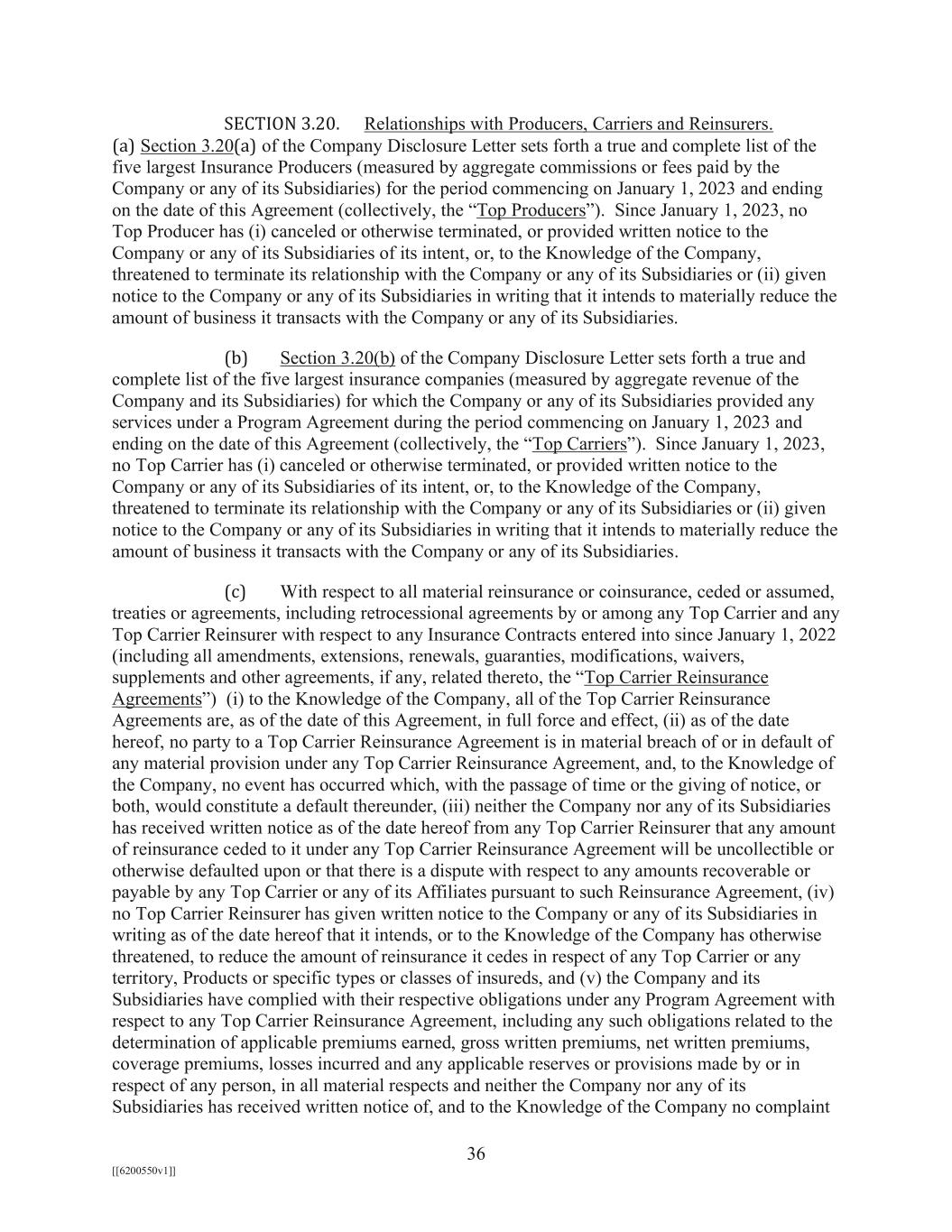 36 [[6200550v1]] Relationships with Producers, Carriers and Reinsurers. Section 3.20 of the Company Disclosure Letter sets forth a true and complete list of the five largest Insurance Producers (measured by aggregate commissions or fees paid by the Company or any of its Subsidiaries) for the period commencing on January 1, 2023 and ending on the date of this Agreement (collectively, the “Top Producers”). Since January 1, 2023, no Top Producer has (i) canceled or otherwise terminated, or provided written notice to the Company or any of its Subsidiaries of its intent, or, to the Knowledge of the Company, threatened to terminate its relationship with the Company or any of its Subsidiaries or (ii) given notice to the Company or any of its Subsidiaries in writing that it intends to materially reduce the amount of business it transacts with the Company or any of its Subsidiaries. Section 3.20(b) of the Company Disclosure Letter sets forth a true and complete list of the five largest insurance companies (measured by aggregate revenue of the Company and its Subsidiaries) for which the Company or any of its Subsidiaries provided any services under a Program Agreement during the period commencing on January 1, 2023 and ending on the date of this Agreement (collectively, the “Top Carriers”). Since January 1, 2023, no Top Carrier has (i) canceled or otherwise terminated, or provided written notice to the Company or any of its Subsidiaries of its intent, or, to the Knowledge of the Company, threatened to terminate its relationship with the Company or any of its Subsidiaries or (ii) given notice to the Company or any of its Subsidiaries in writing that it intends to materially reduce the amount of business it transacts with the Company or any of its Subsidiaries. With respect to all material reinsurance or coinsurance, ceded or assumed, treaties or agreements, including retrocessional agreements by or among any Top Carrier and any Top Carrier Reinsurer with respect to any Insurance Contracts entered into since January 1, 2022 (including all amendments, extensions, renewals, guaranties, modifications, waivers, supplements and other agreements, if any, related thereto, the “Top Carrier Reinsurance Agreements”) (i) to the Knowledge of the Company, all of the Top Carrier Reinsurance Agreements are, as of the date of this Agreement, in full force and effect, (ii) as of the date hereof, no party to a Top Carrier Reinsurance Agreement is in material breach of or in default of any material provision under any Top Carrier Reinsurance Agreement, and, to the Knowledge of the Company, no event has occurred which, with the passage of time or the giving of notice, or both, would constitute a default thereunder, (iii) neither the Company nor any of its Subsidiaries has received written notice as of the date hereof from any Top Carrier Reinsurer that any amount of reinsurance ceded to it under any Top Carrier Reinsurance Agreement will be uncollectible or otherwise defaulted upon or that there is a dispute with respect to any amounts recoverable or payable by any Top Carrier or any of its Affiliates pursuant to such Reinsurance Agreement, (iv) no Top Carrier Reinsurer has given written notice to the Company or any of its Subsidiaries in writing as of the date hereof that it intends, or to the Knowledge of the Company has otherwise threatened, to reduce the amount of reinsurance it cedes in respect of any Top Carrier or any territory, Products or specific types or classes of insureds, and (v) the Company and its Subsidiaries have complied with their respective obligations under any Program Agreement with respect to any Top Carrier Reinsurance Agreement, including any such obligations related to the determination of applicable premiums earned, gross written premiums, net written premiums, coverage premiums, losses incurred and any applicable reserves or provisions made by or in respect of any person, in all material respects and neither the Company nor any of its Subsidiaries has received written notice of, and to the Knowledge of the Company no complaint